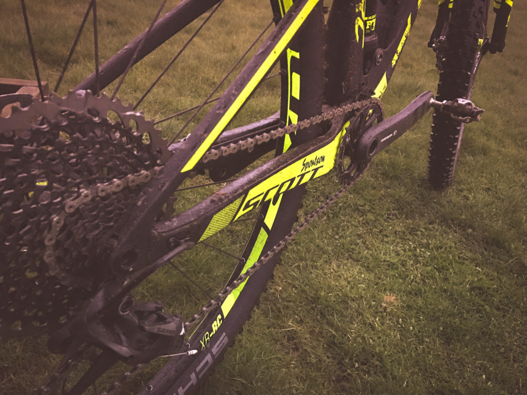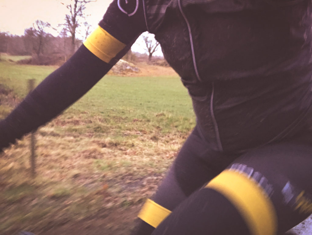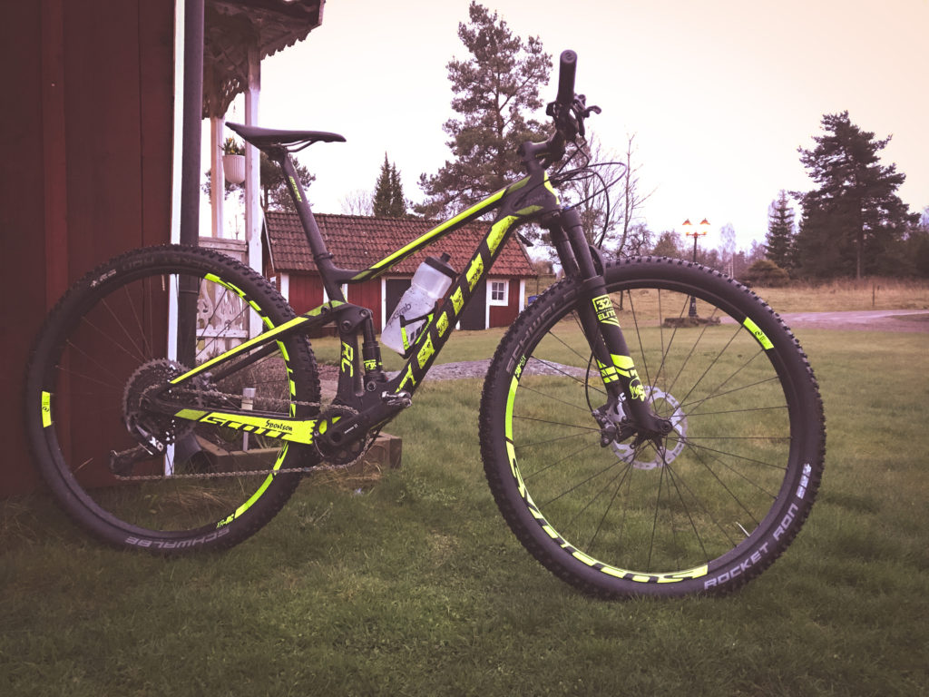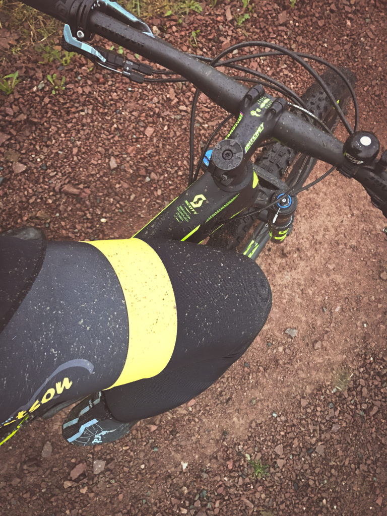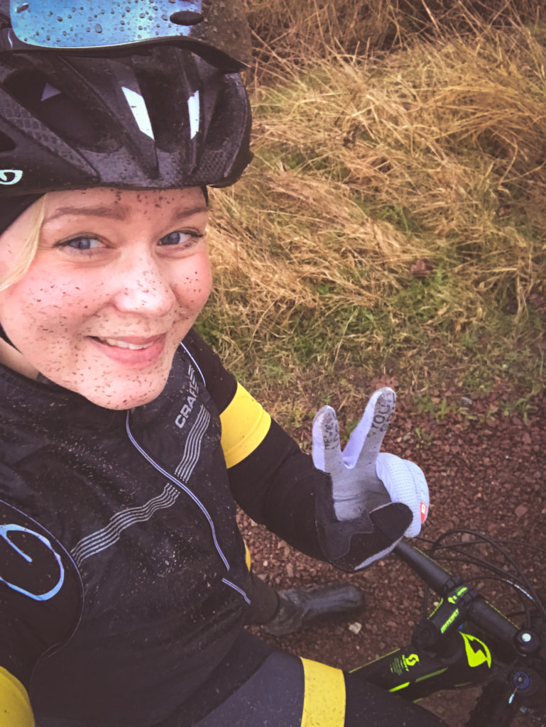 Jag är skitig, jag har leriga fräknar och ett stort leende i ansiktet. Jag har ingen aning om hur fort jag cyklar. Jag har ingen aning om hur långt. Jag har ingen aning om vilken vikt jag ska justera mina dämpare efter. Liten L coachar och bestämmer inifrån magen. Det får inte gå fort uppför men det känns tryggt, lagom snabbt och kul nedför och ganska lagom på platten. Mitt system får jobba men jag får inte pressa det och kroppen visar tydligt var gränsen går. Jag slirar i leran uppför och skrattar, magen är lagom stor men extrakilona förändrar hur cykeln uppför sig mycket.