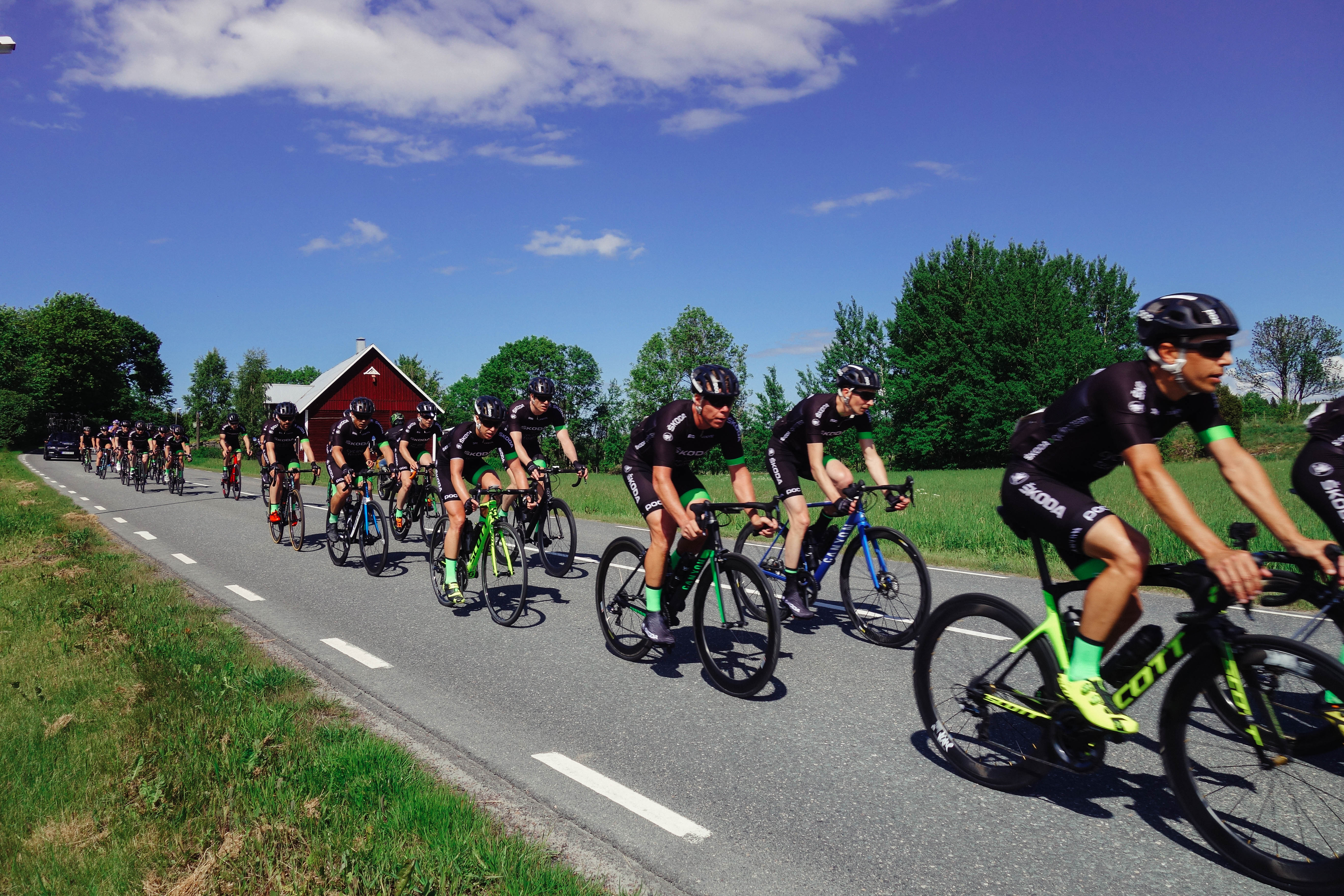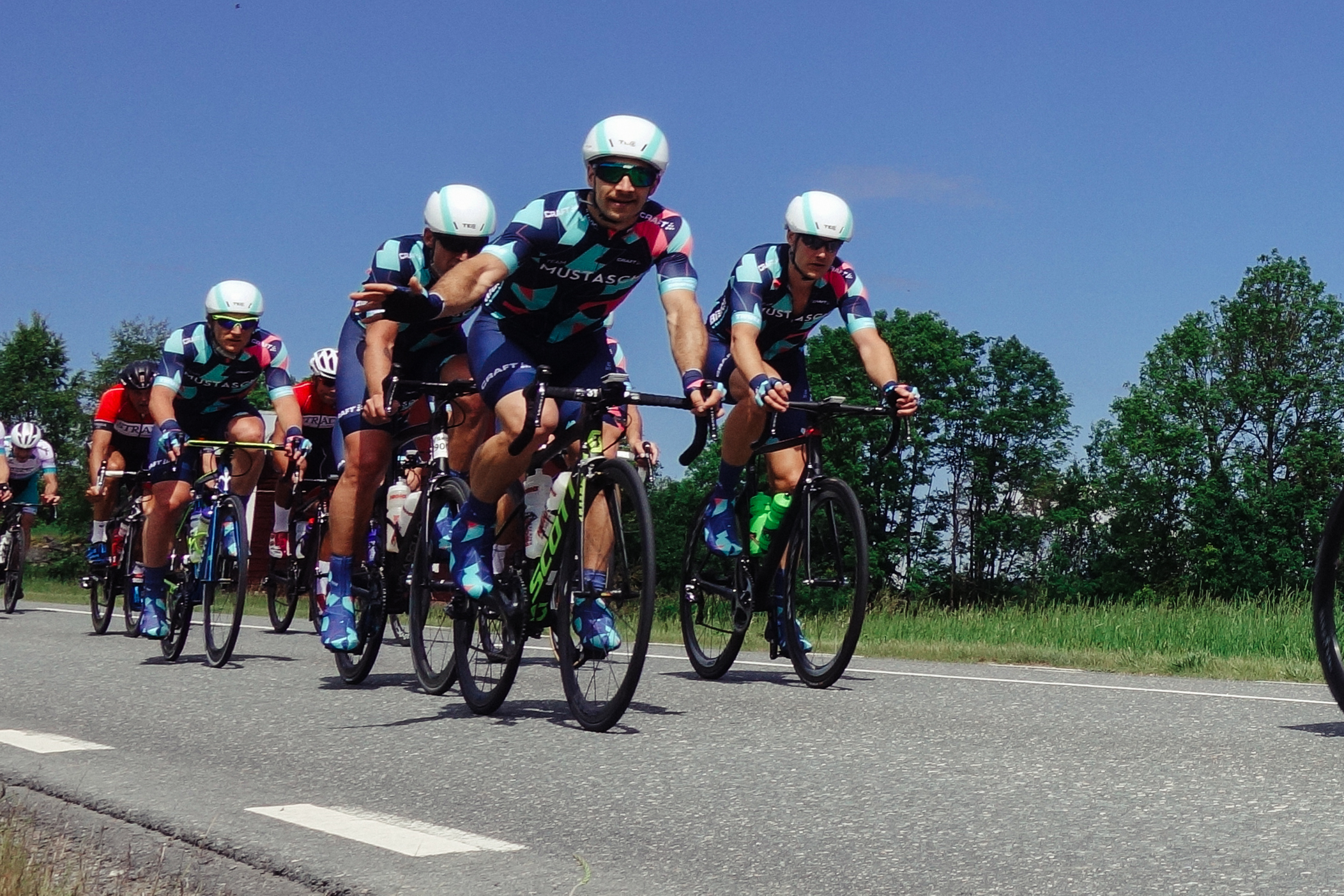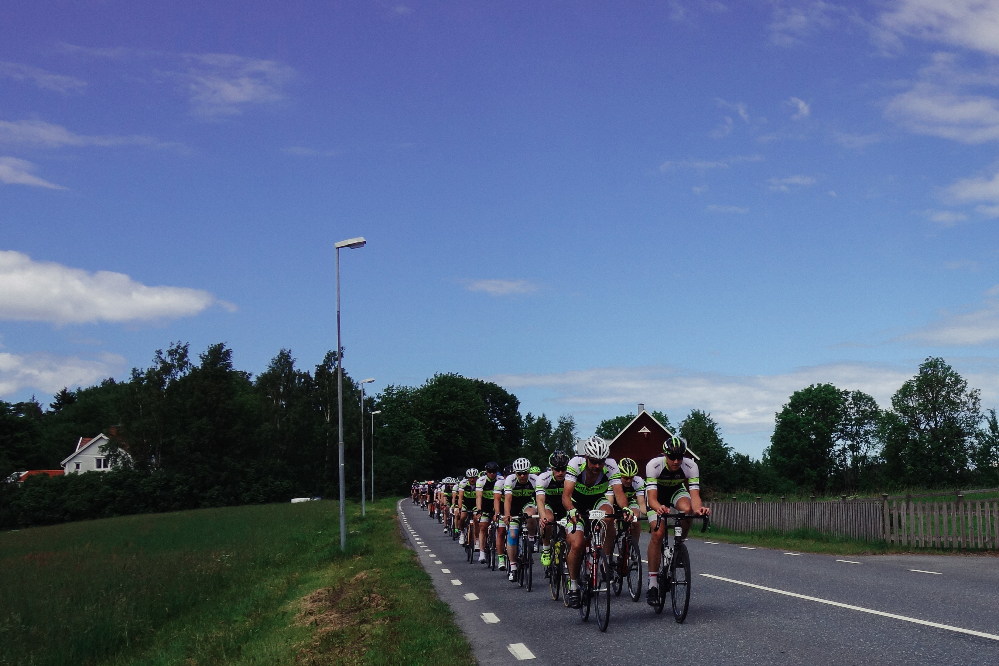Vi snackade lite med grannarna och väntade och brände oss i solen och kollade på Vätternrundans livesändning för att ha koll och till slut kom de, första fina gänget som var Ablocs Team Mustasch – ett gäng sköna typer i snygga kit som cyklade stiligt och snabbt och samlade in pengar till förmån för forskning kring prostatacancer. Grym grej. Det var roligt att se dem swischa förbi i snygg klunga och både Richard Larsén och IKHPs grymma Stefan Stolpe vinkade loss. Typiskt trevligt med folk som vinkar ändå fastän riktiga fotografer inte alls blir imponerade av att folk vinkar till dem. Jag är en hobbyfotograf och får ändå varannan bild suddig eller konstig så lite vink livar upp.