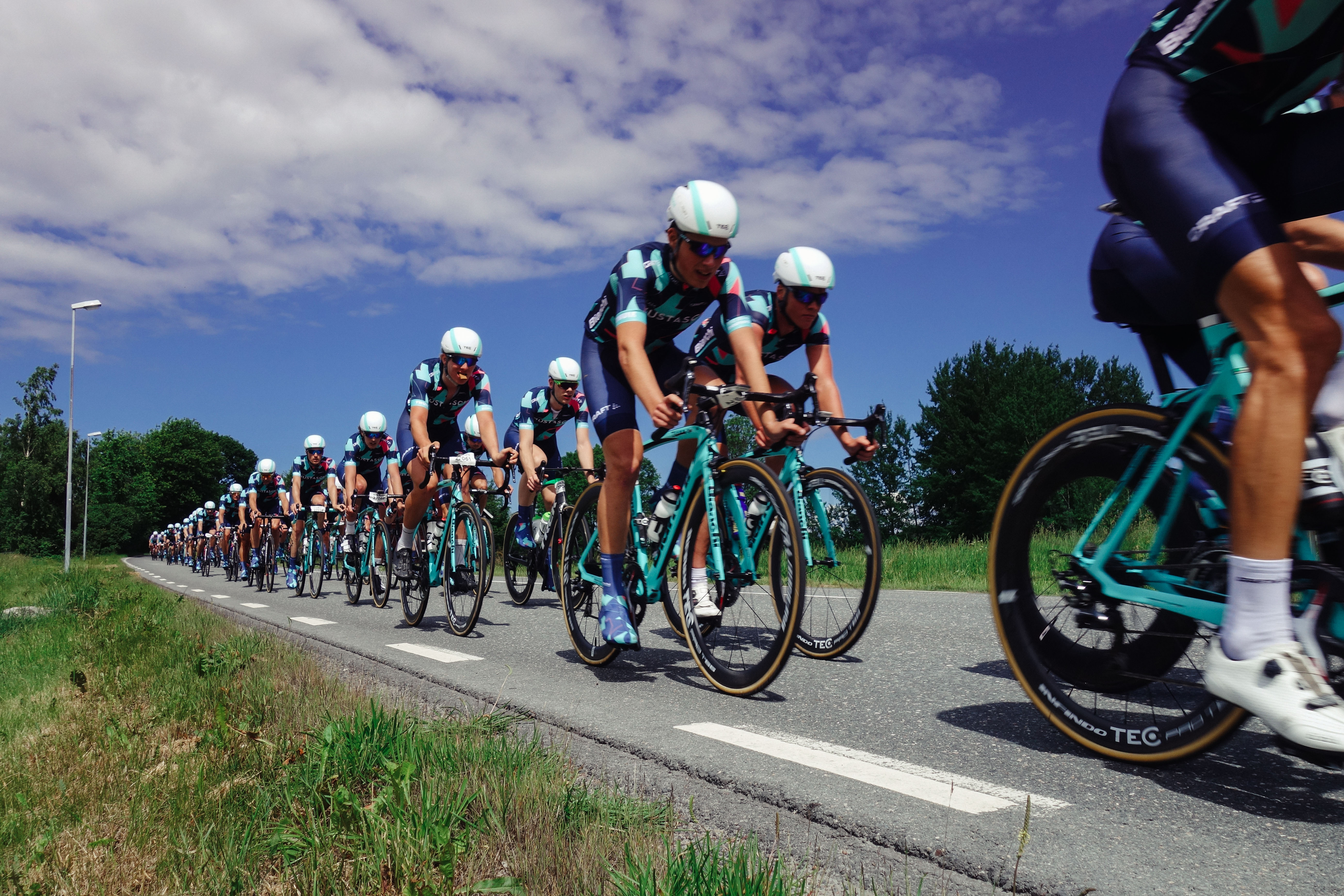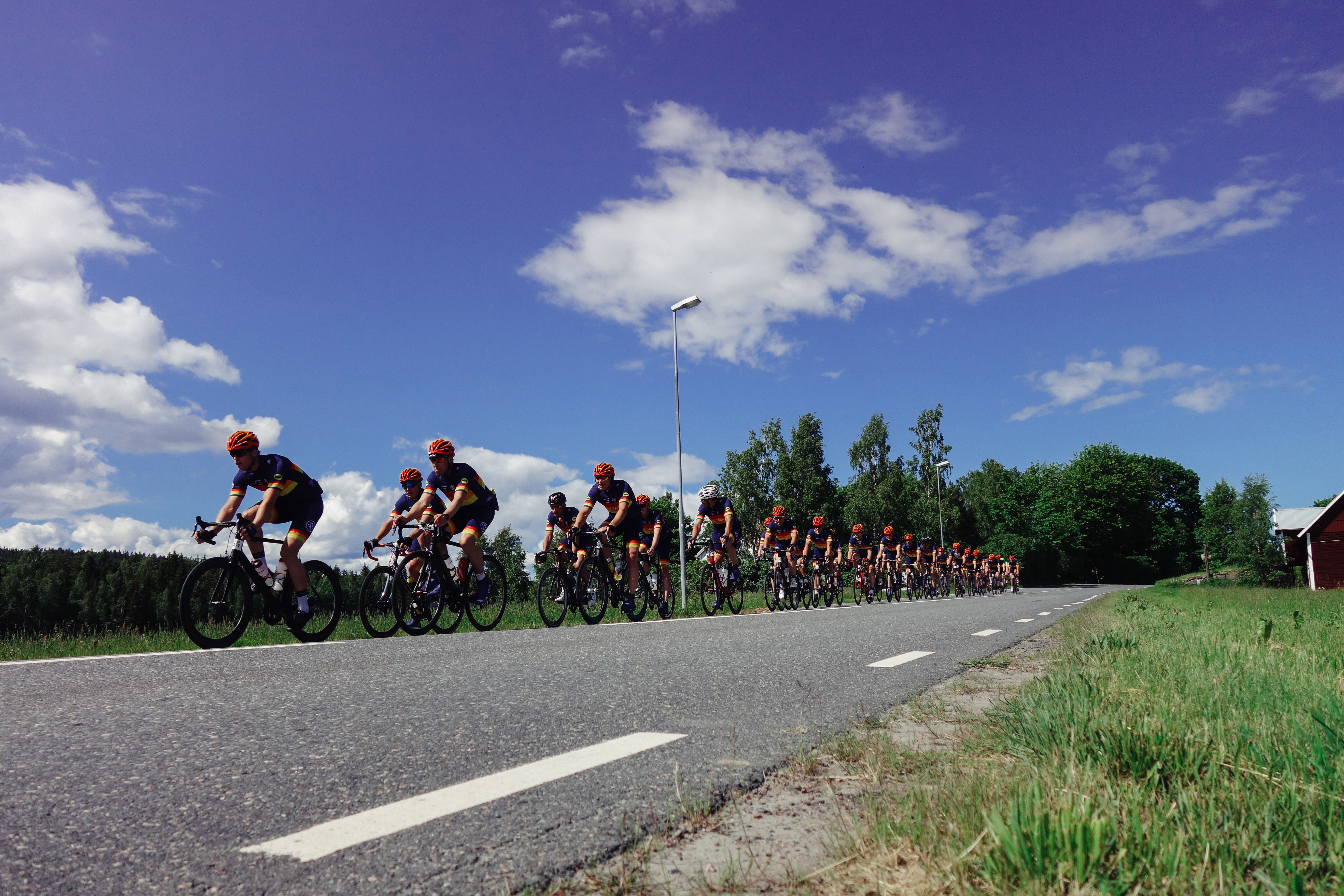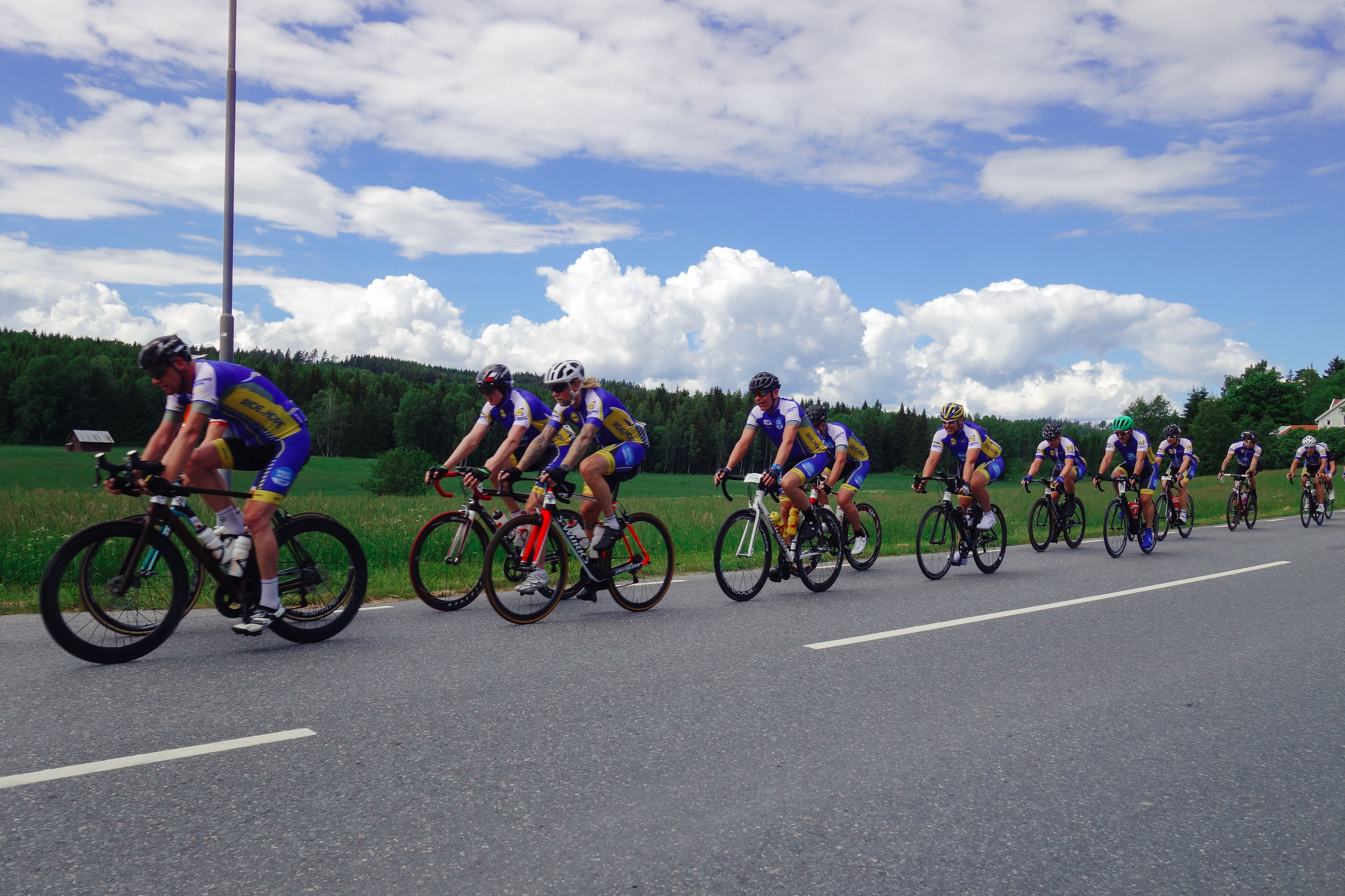 Vi snackade lite med grannarna och väntade och brände oss i solen och kollade på Vätternrundans livesändning för att ha koll och till slut kom de, första fina gänget som var Ablocs Team Mustasch – ett gäng sköna typer i snygga kit som cyklade stiligt och snabbt och samlade in pengar till förmån för forskning kring prostatacancer. Grym grej. Det var roligt att se dem swischa förbi i snygg klunga och både Richard Larsén och IKHPs grymma Stefan Stolpe vinkade loss. Typiskt trevligt med folk som vinkar ändå fastän riktiga fotografer inte alls blir imponerade av att folk vinkar till dem. Jag är en hobbyfotograf och får ändå varannan bild suddig eller konstig så lite vink livar upp.