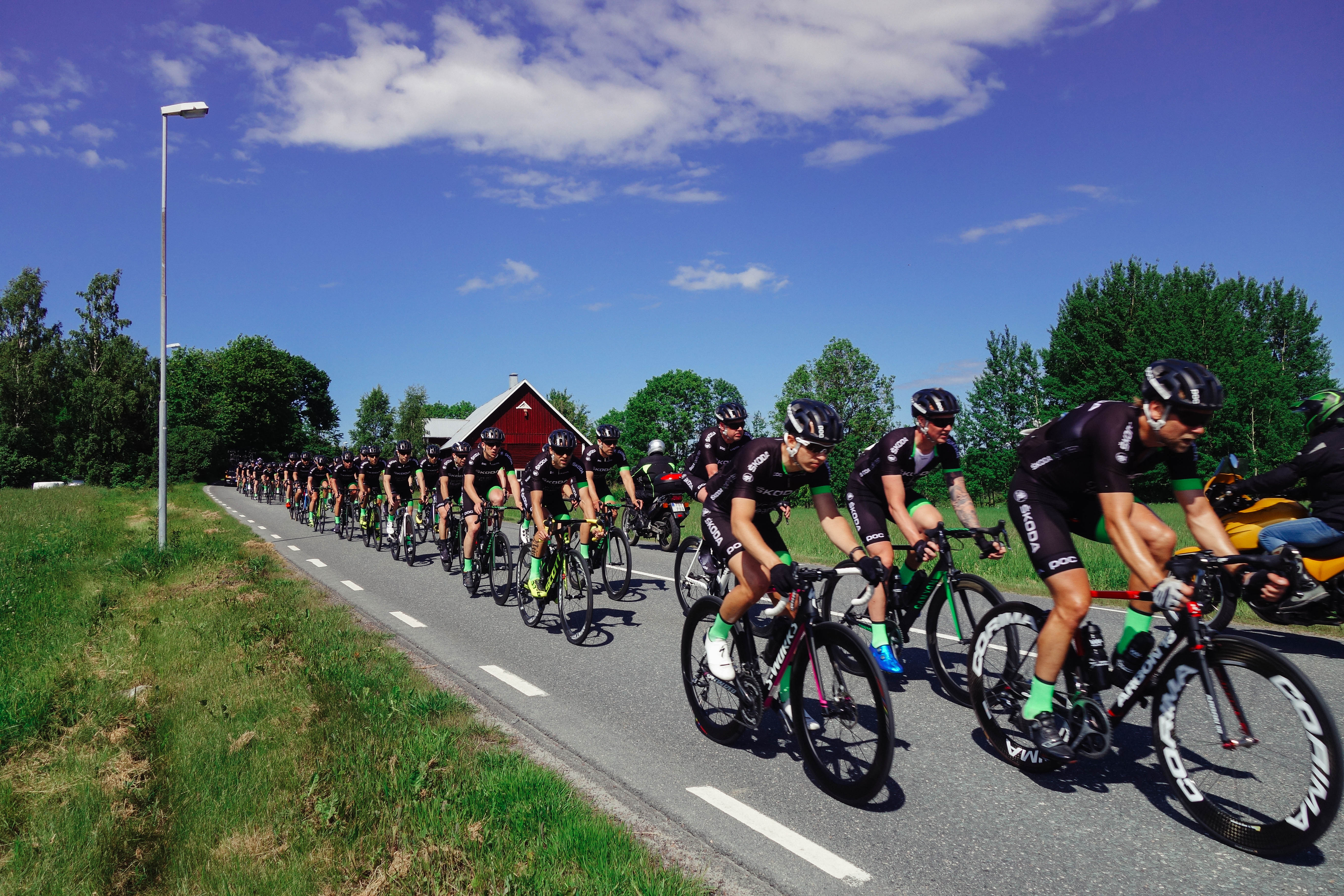 Sedan rullade det på. Höhöhöhö. Vi bestämde oss för att hänga kvar tills vi fått heja på Skoda-teamet med grymma Tessan och lite andra kändisar innan vi stack tillbaka hem. Team Skoda startade lite senare så vi fick chans att se massa andra goa cyklister innan de dök upp. Det var klungor från alla möjliga ställen, en del höll ihop ett fint lagtempo och andra verkade behöva stanna och bli uppläxade av lagkapten och göra om och göra rätt. Någon hade tappat men var glad ändå, någon annan skickade lite mordiska blickar när vi hejade på dem att jobba vidare solo. Fullt förståeligt.