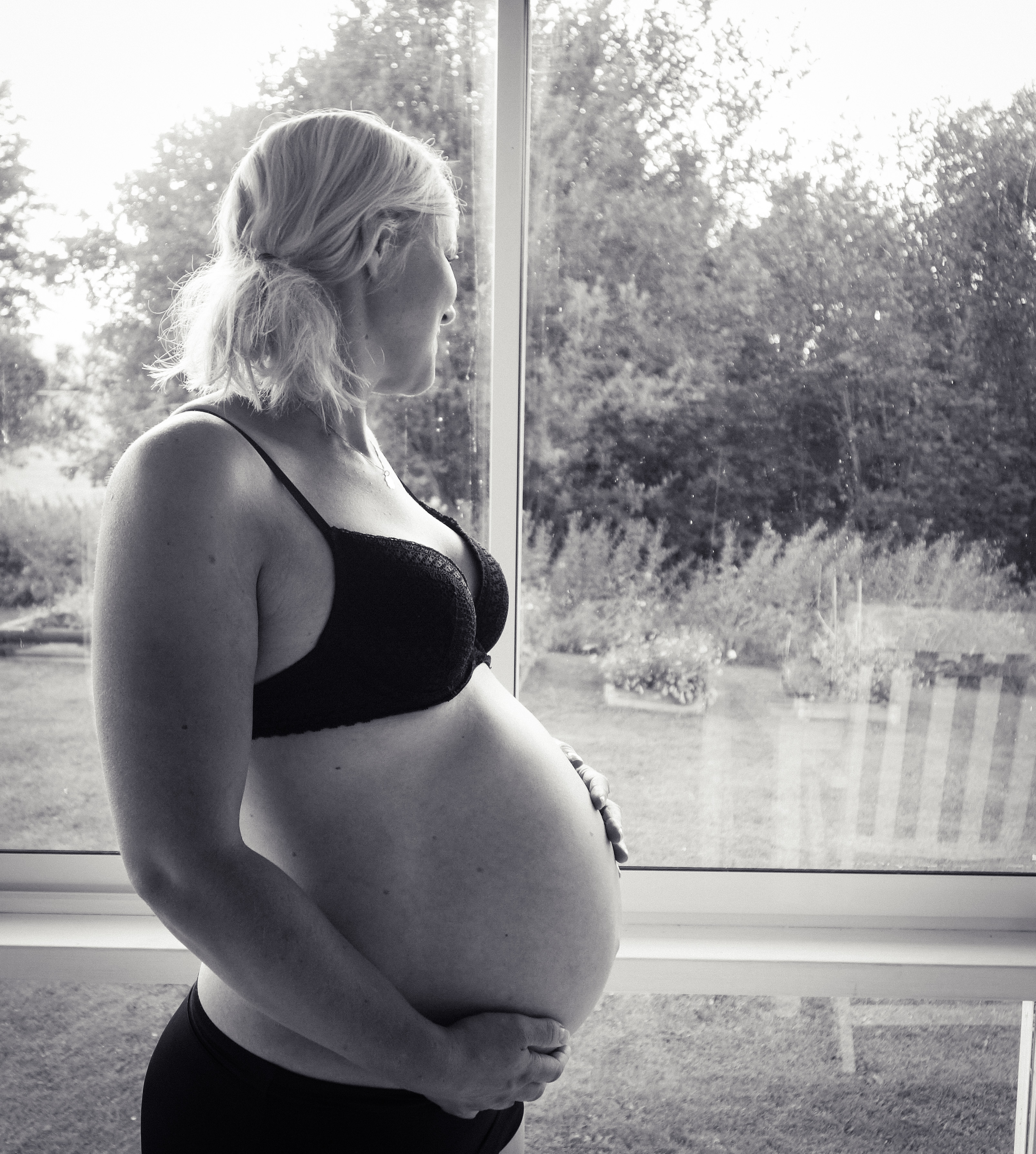 Vår barnmorska tyckte vi skulle passa på att ta lite bilder på magen så det gjorde vi. Alla bilder hittills förutom någon instagrambild från stranden och någon suddig hängmattebild är ju bilder där jag har lycra på mig. Eftersom jag i vanliga fall inte klär av mig för att visa när magrutorna är på plats har jag inte heller gjort det för att visa bebismagen men ingen regel utan undantag – så några magbilder i undisar blev det till slut. Vi hade tänkt ta dem på stranden i Röttle men där var så mycket folk så jag kände mig inte det minsta bekväm och istället åkte vi hem och Jimmy knäppte några bilder i uterummet, med obligatorisk katt förstås.