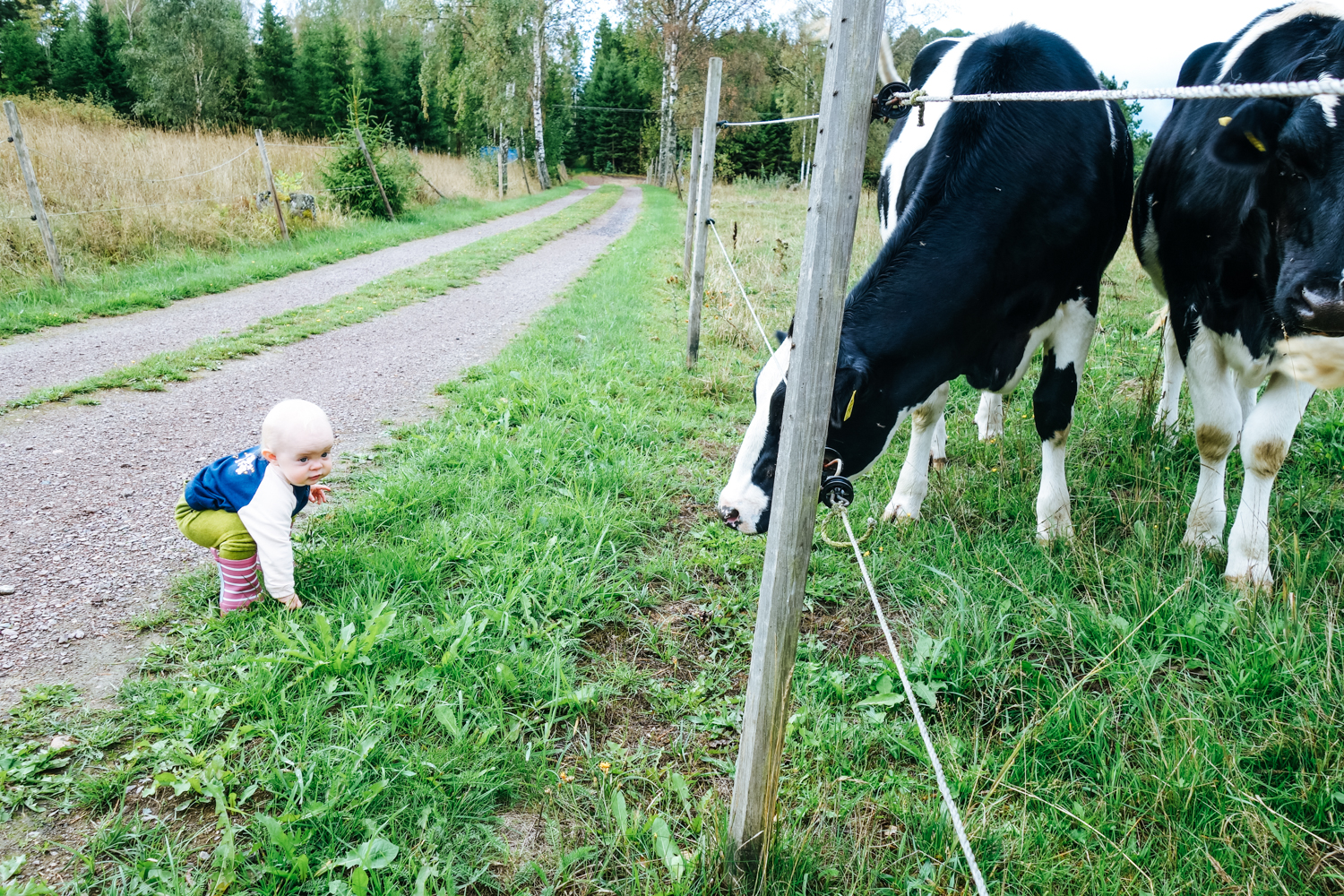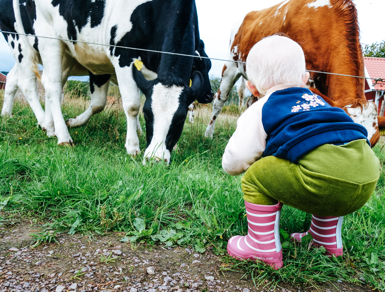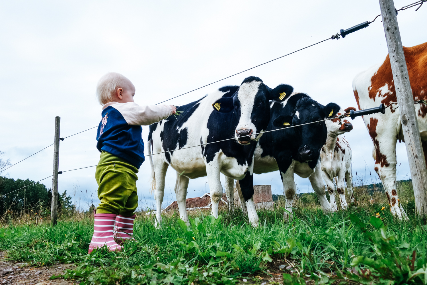 Och så går vi bort till kohagen och plockar gräs och matar kossera. Det är ett stort äventyr att stövla iväg och mata korna må ni tro och det är så fint att få dela hennes stora äventyr.