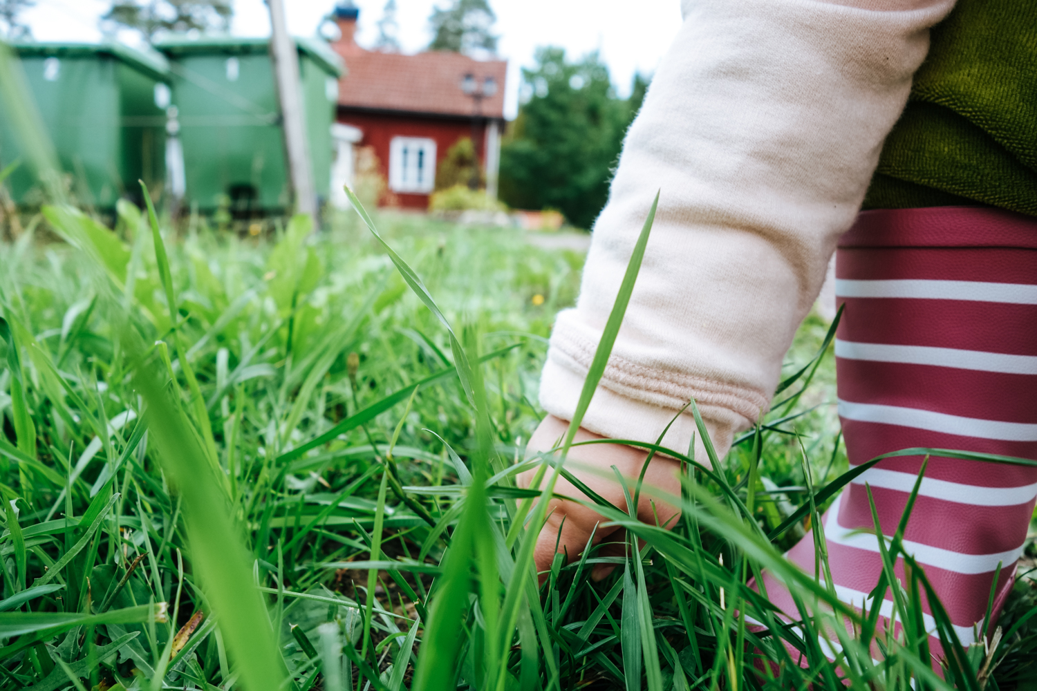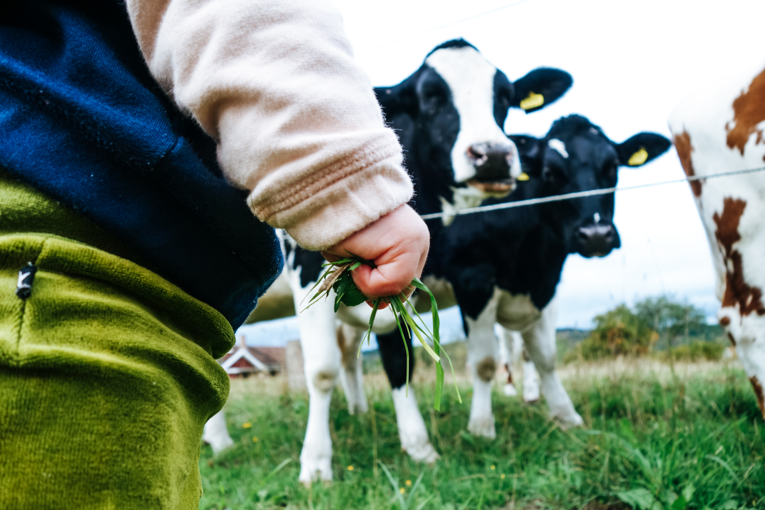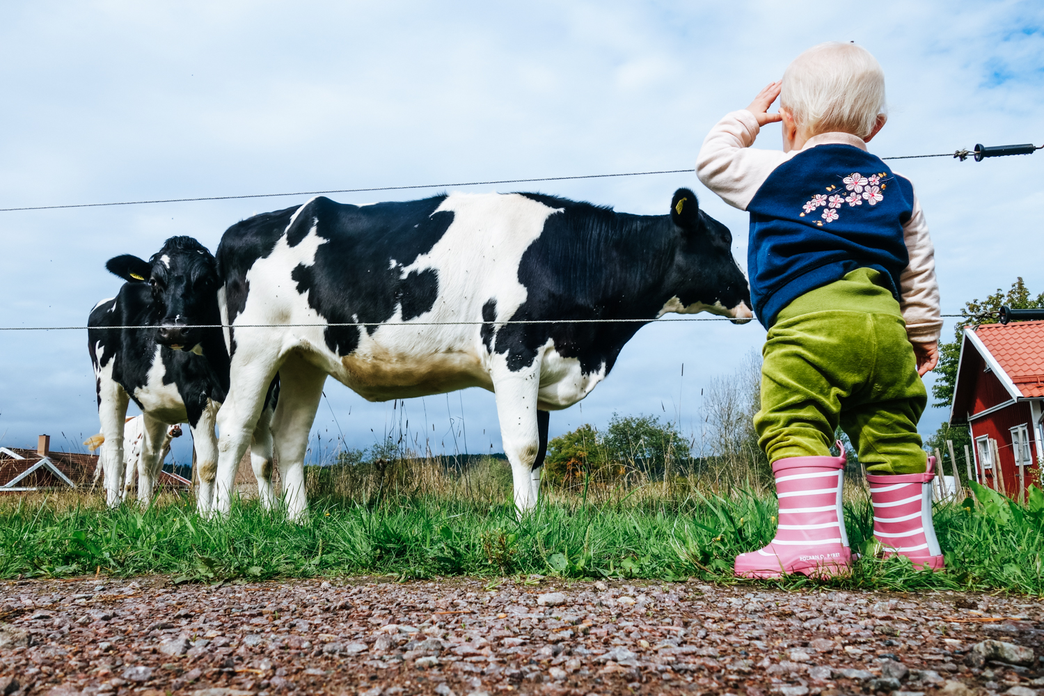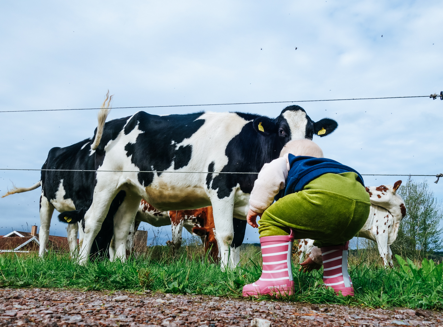 Och så går vi bort till kohagen och plockar gräs och matar kossera. Det är ett stort äventyr att stövla iväg och mata korna må ni tro och det är så fint att få dela hennes stora äventyr.
