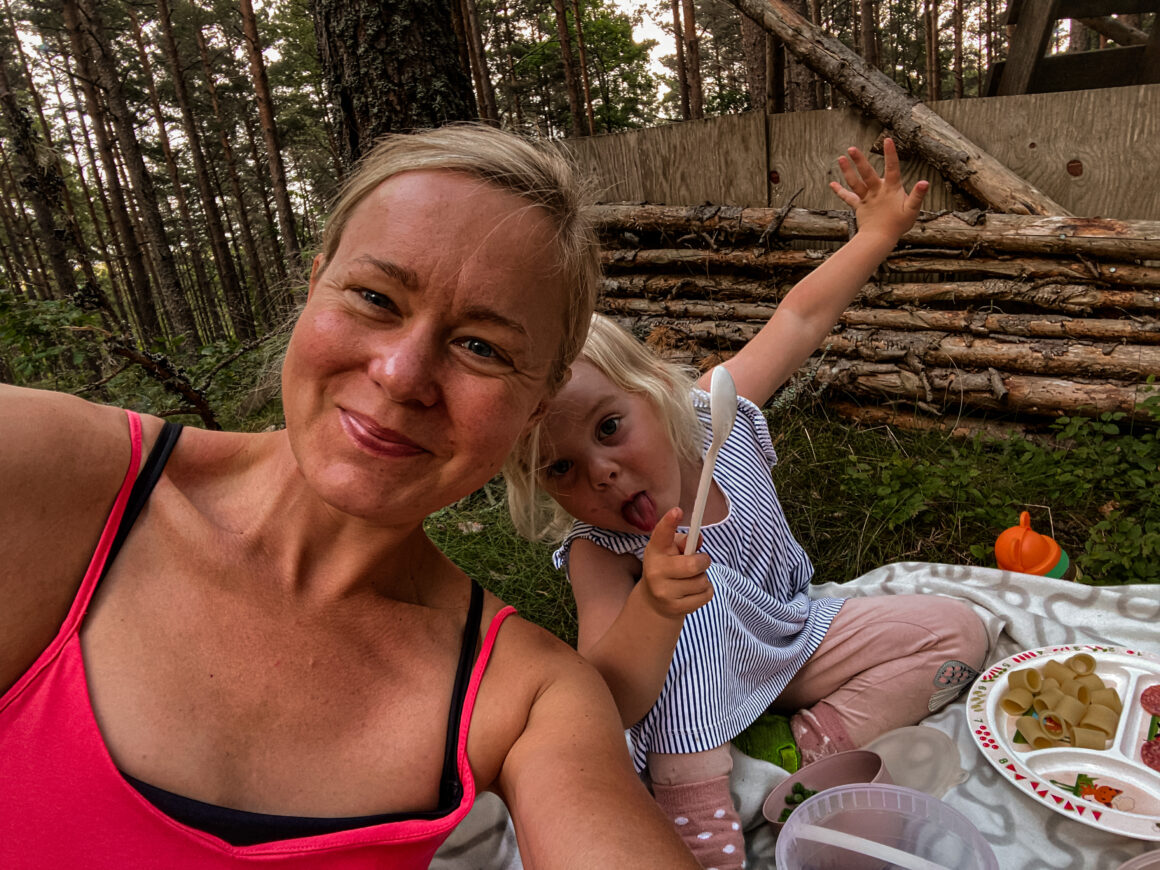 Att jag rafsar ned en burk med gårdagens makaroner, ketchupflaska och en flaska vatten i en väska och sticker ut med min unge till första bästa lilla skogsdunge och har världens goaste snack räknas. När vi sitter i mossan med gårdagens rester och min lilla säger “mamma, jag älskar det här ljudet” och jag frågar vilket hon menar och hon fortsätter “det från vinden däruppe i träden och fåglarna” – då gills det mer än väl som friluftsliv.
