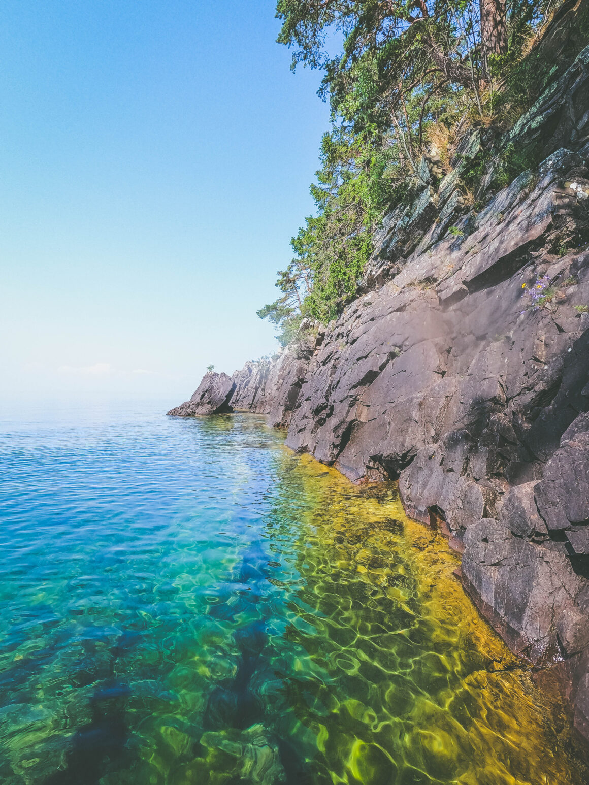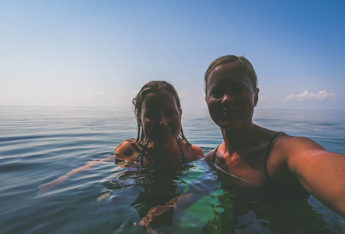 Vättern var ovanligt varm och man ville liksom aldrig gå upp, det var så makalöst vackert. Här, där det inte är så mycket folk är vattnet klart och det pirrar härligt när man tittar nedåt. Det är sjutton meters siktdjup i Vättern, och tanken på att det kanske, kanske är hela sjutton meter ned till det man anar på botten är mäktig.