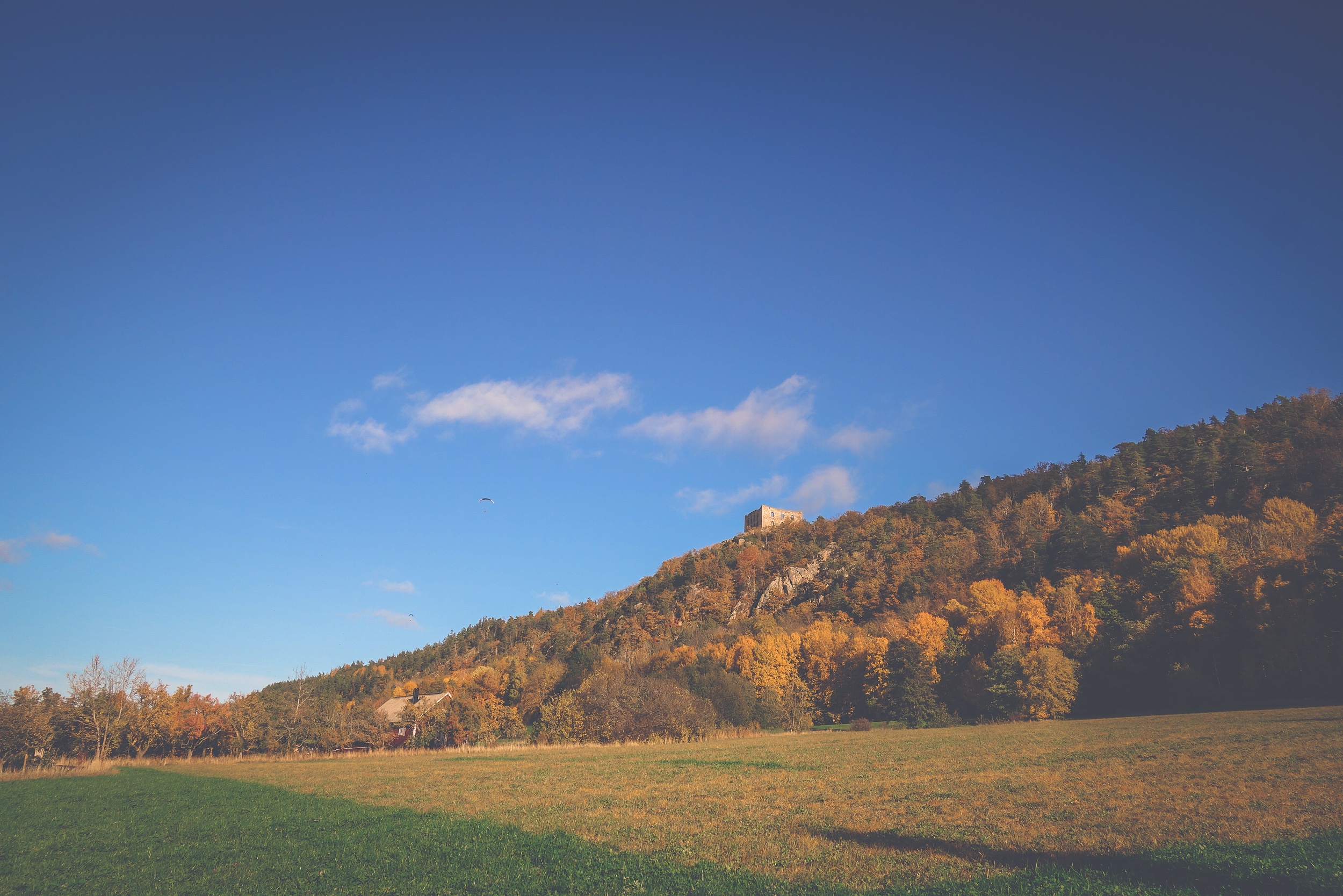 Det är ofta skärmflygare i luften här. Den här vackra dagen var inget undantag, två skärmar flög runt högt däruppe medans jag gick upp till slottsruinen.