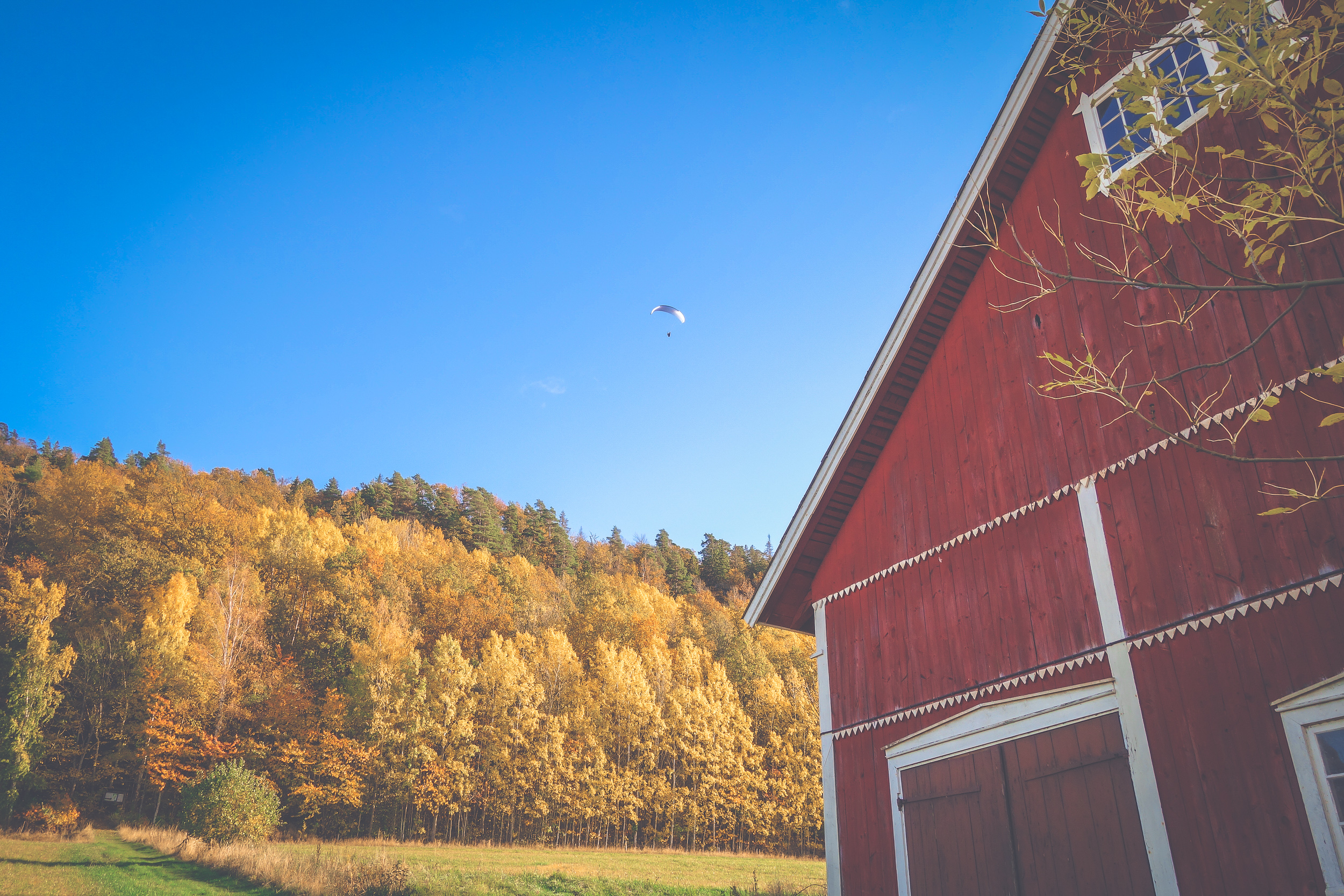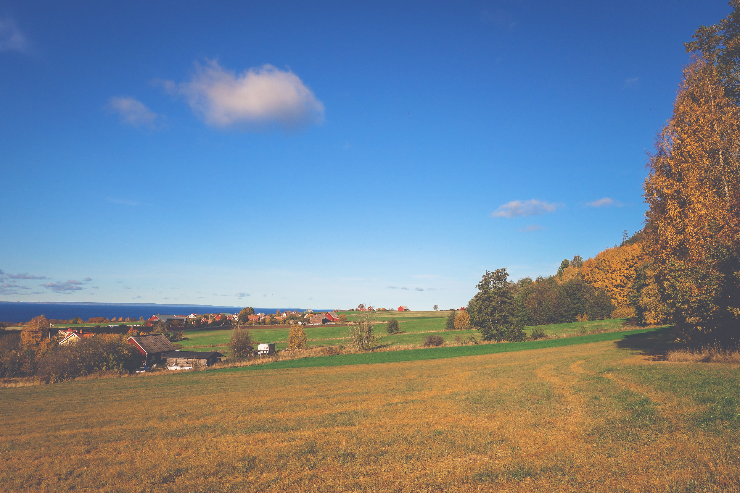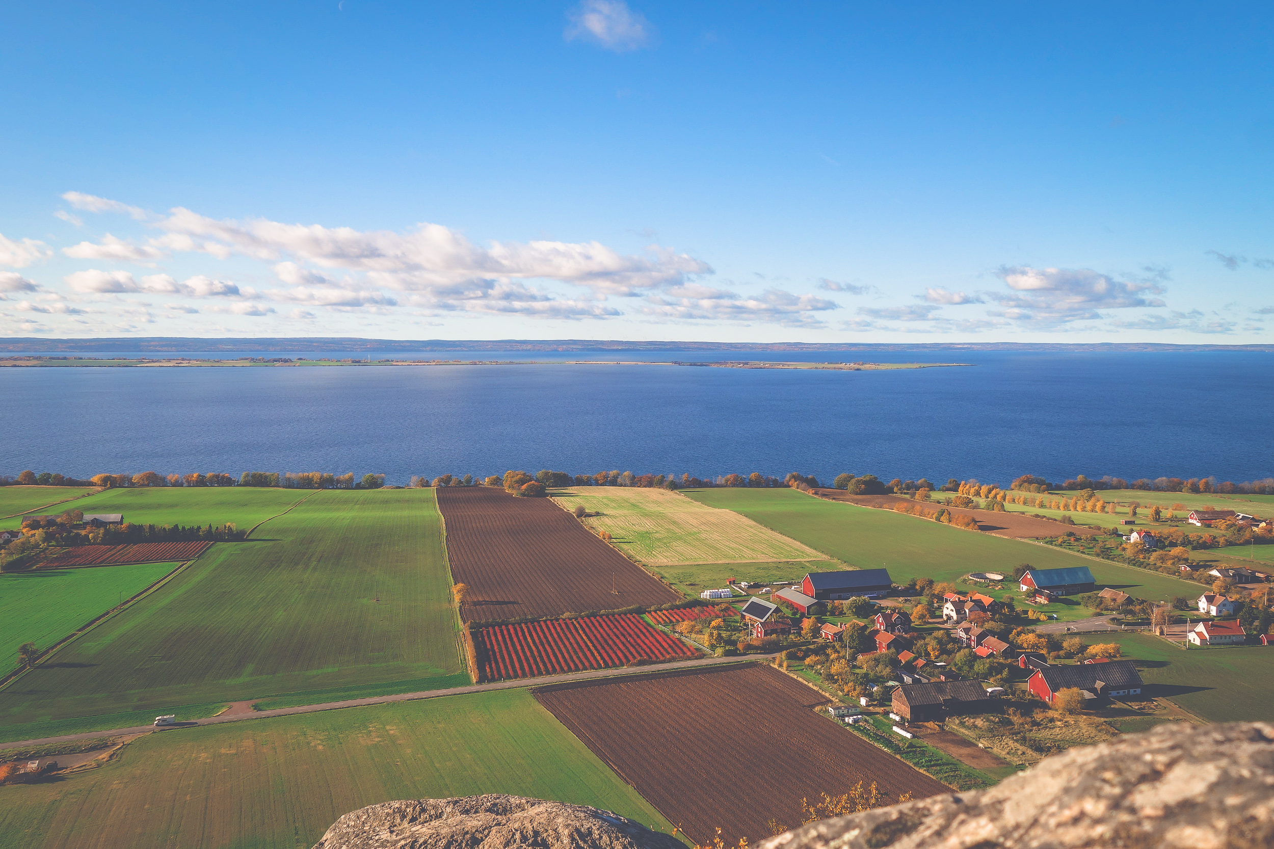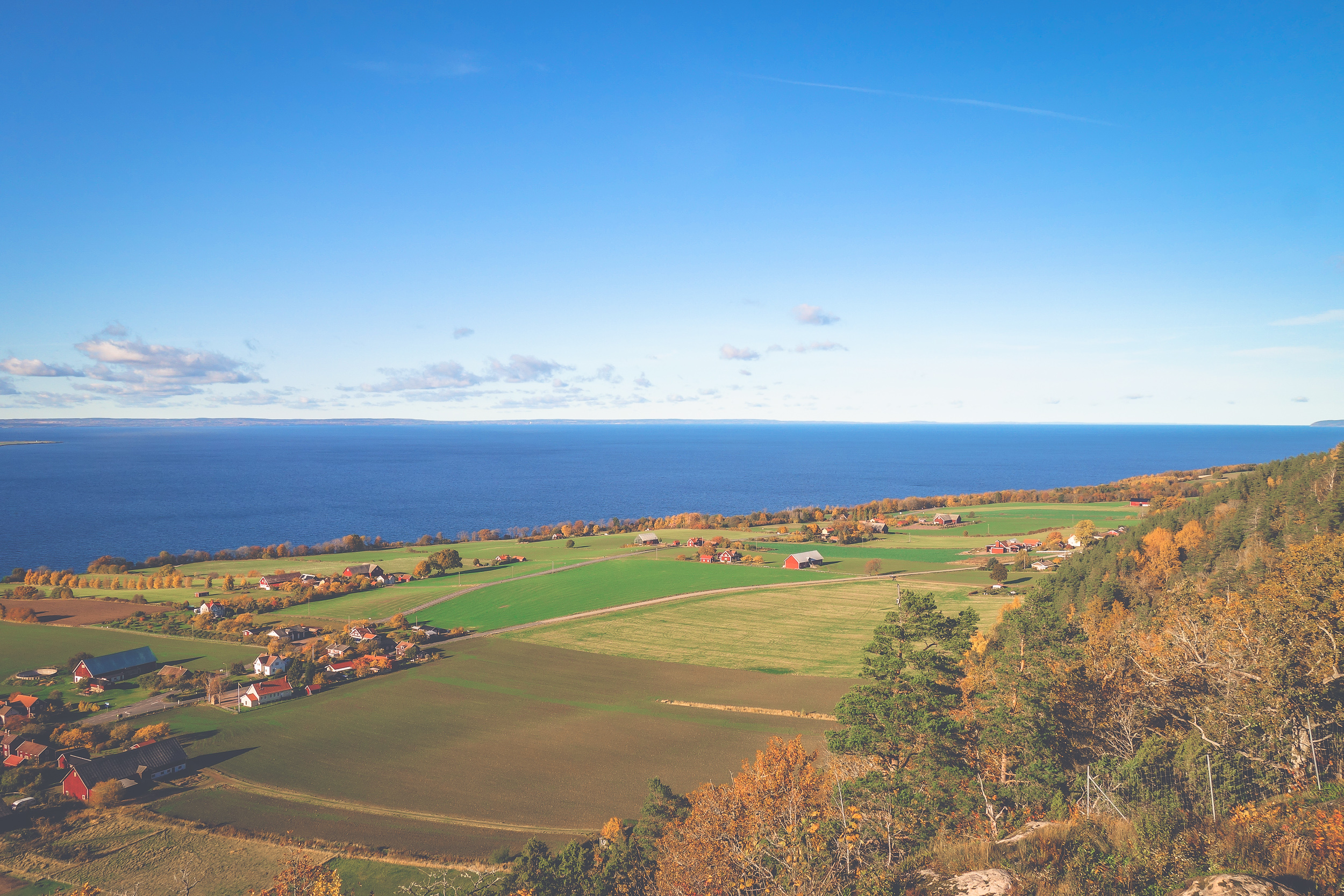 Ser du de röda buskarna där nere? Det är Lillmattsa blåbärsodlingar i höstskrud. På Lillmattsa i Uppgränna de har självplock av sådana där stora blåbär som är supersnygga på gröten eller tårtan.