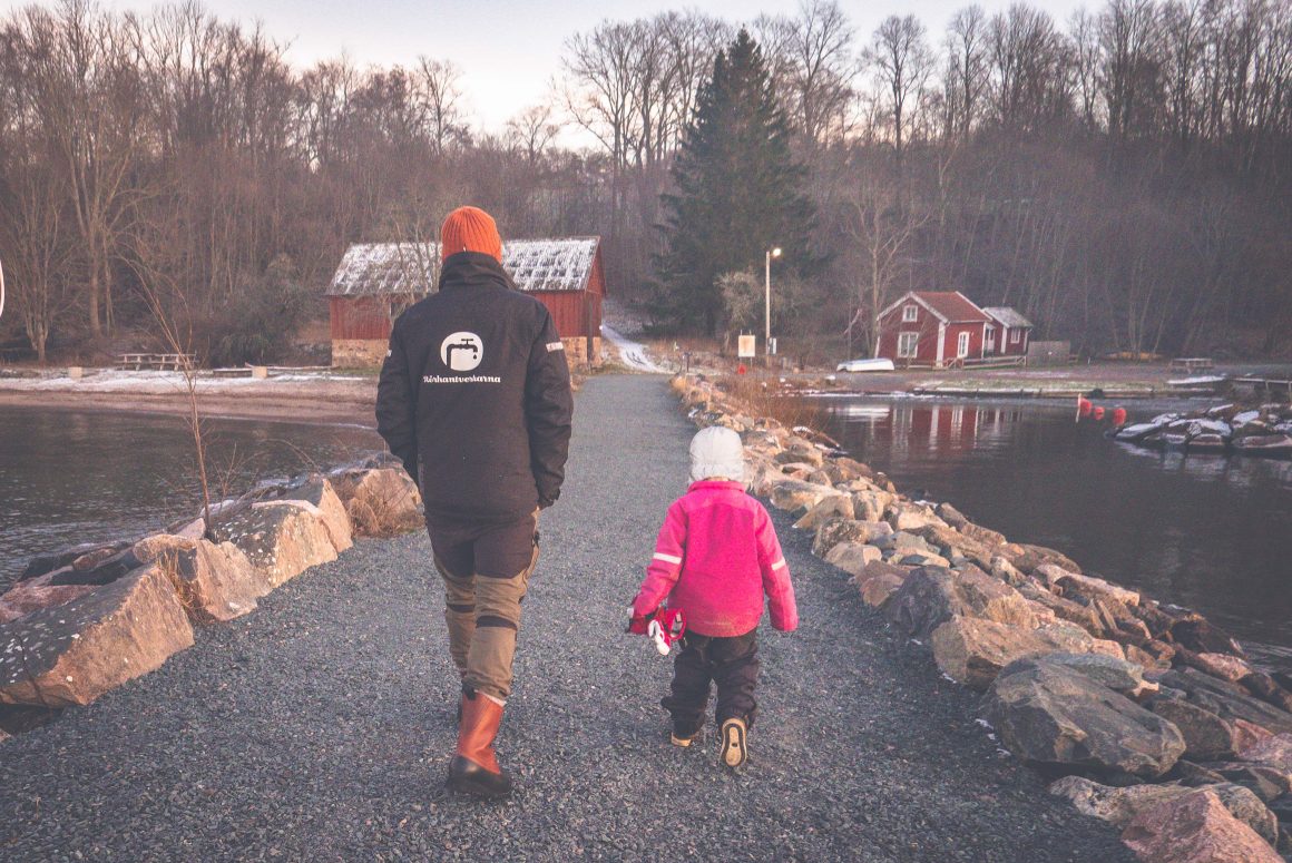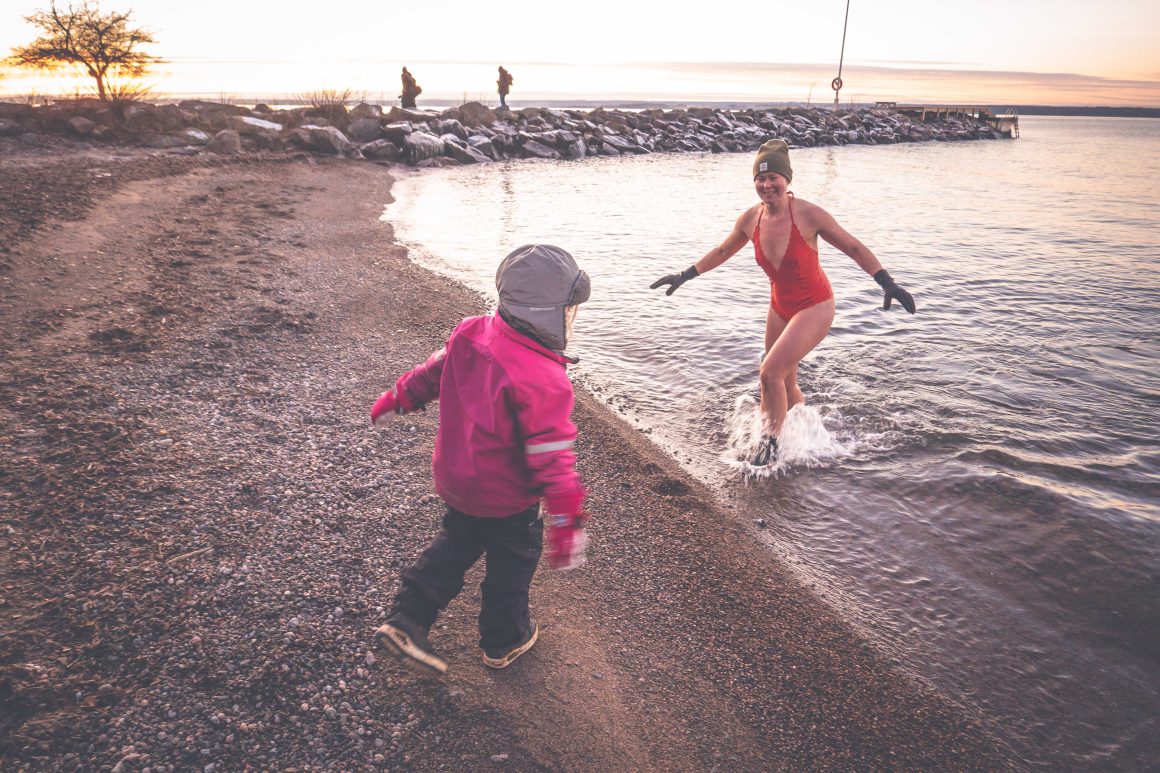 Lovis skulle också bada tyckte hon och vi kör ju på vårt sätt att vara föräldrar och lät henne försöka. Jag var tvärsäker på att hon skulle ändra sig så fort hon känt på vattnet men hon drog det faktiskt så långt att vi tog fram hennes baddräkt och klädde av kläder. Men – när underställströjan skulle av ändrade hon sig och gallskrek i protest. Pjuh tyckte vi föräldrar som egentligen inte alls var sugna på att hantera kall och blöt unge i minusgrader.