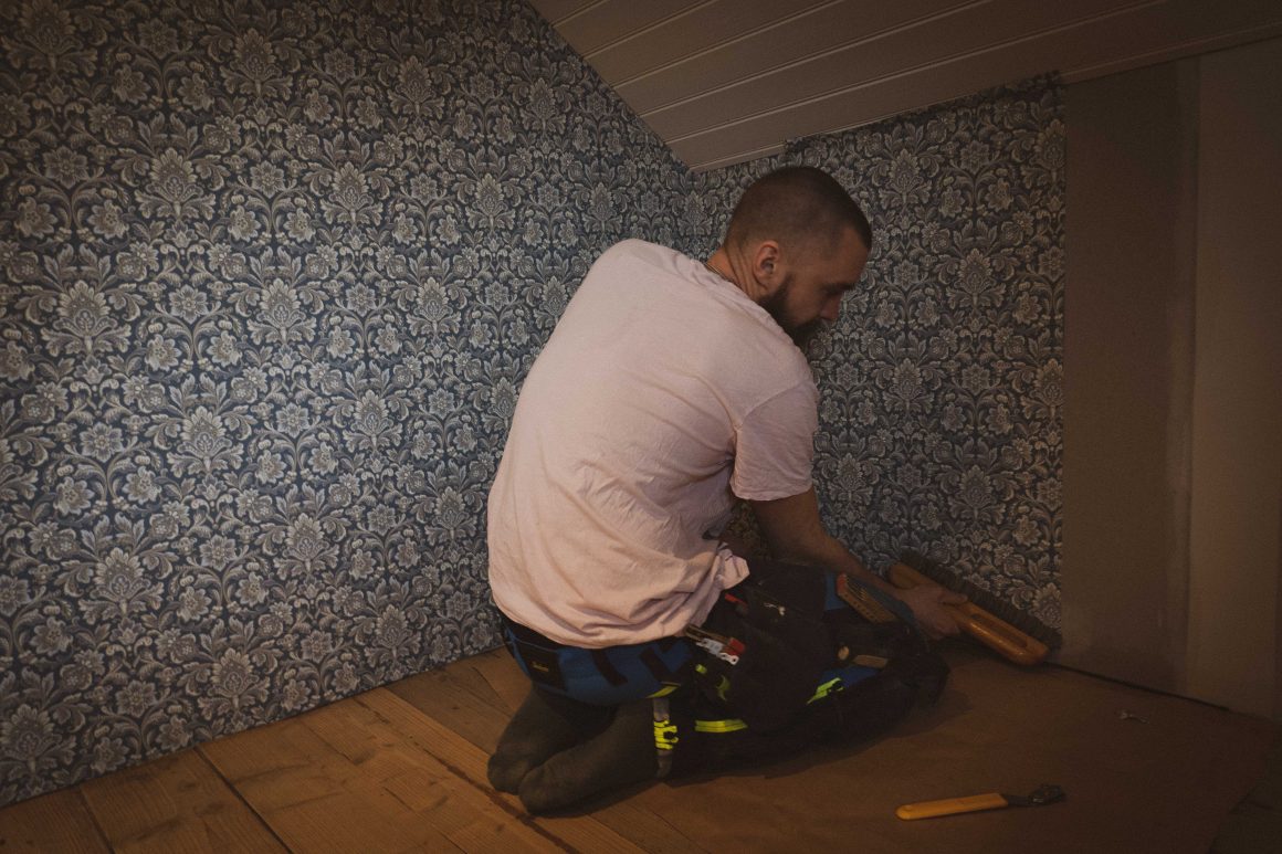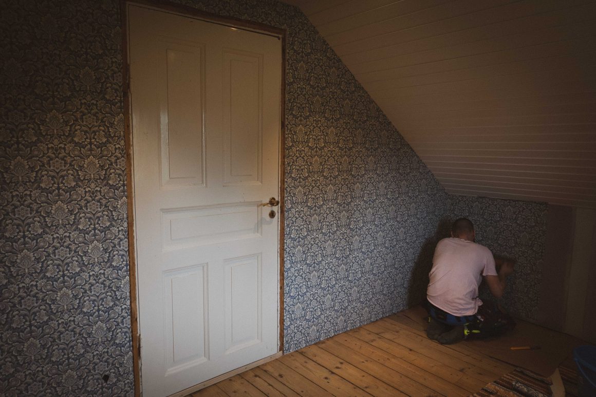 Idag har vi (håll i dig) tapetserat ett rum till på övervåningen. För några veckor sedan fick hallen gul tapet och idag fick det lilla sovrummet en blåblommig tapet. Det är visserligen ett härj kvar med lister och fönsterfoder och lite el. Men skit i det – vi närmar oss något viktigt: sovrum till oss vuxna inomhus och ett eget rum till Lovis.