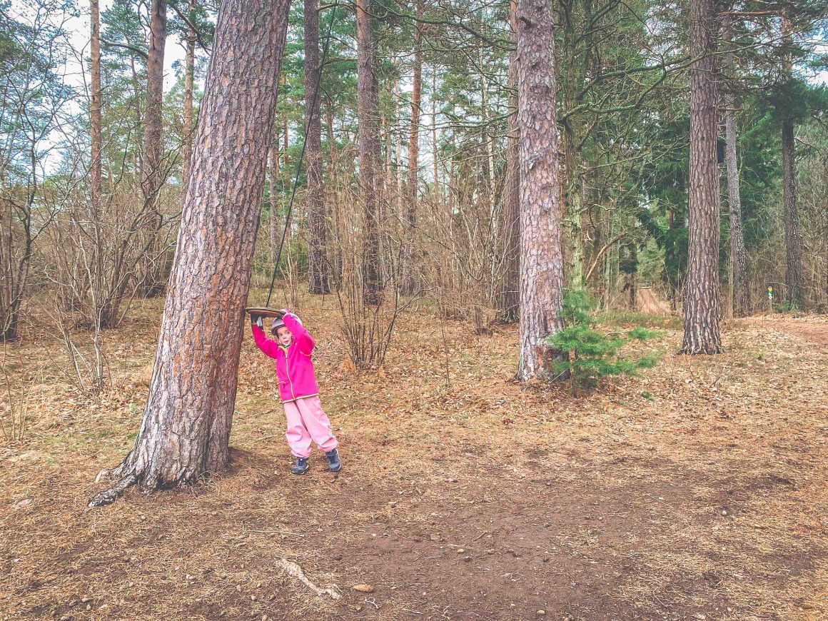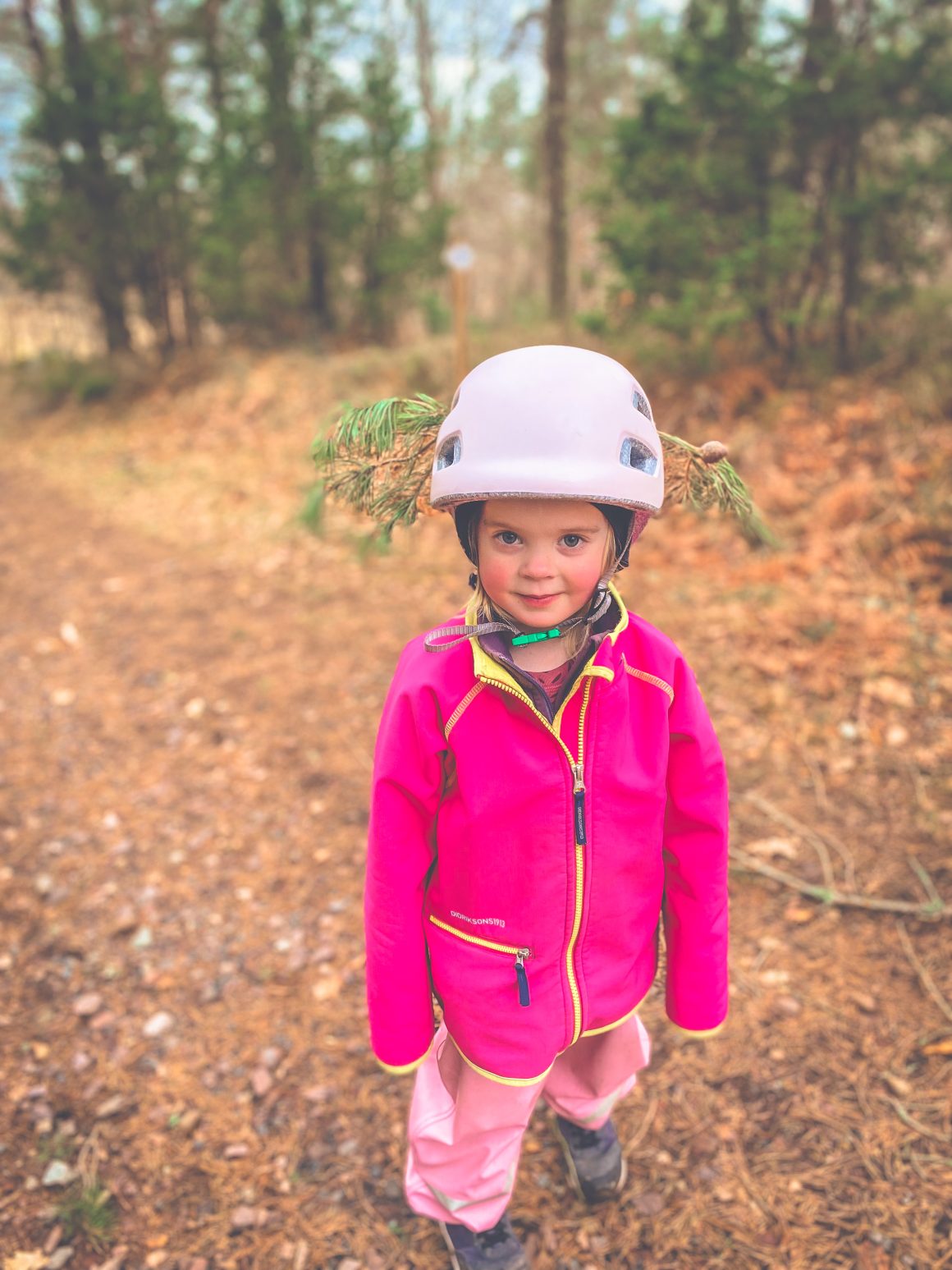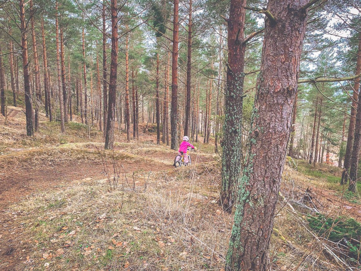 Lika mycket helt själv pushar hon sin lilla cykel uppför backen för att komma till starten av flowlederna. Jag får peppa henne, det är lite tungt. Vi stannar två gånger på vägen, pustar och snackar om spåren från hästarna och att hästar och enhörningar gnäggar olika. Men hon pushar sin cykel helt själv, bara det får ta hennes tid.