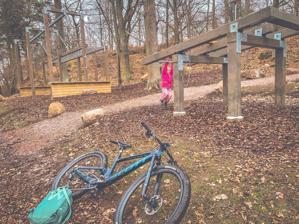 Två nya varv i pumptracken, sedan springa lite till fots på en vippbräda. Vi rullar ned till utegymmet. Hon testar alla grejer. Sedan tvättar vi cykel. Mera bra snack.