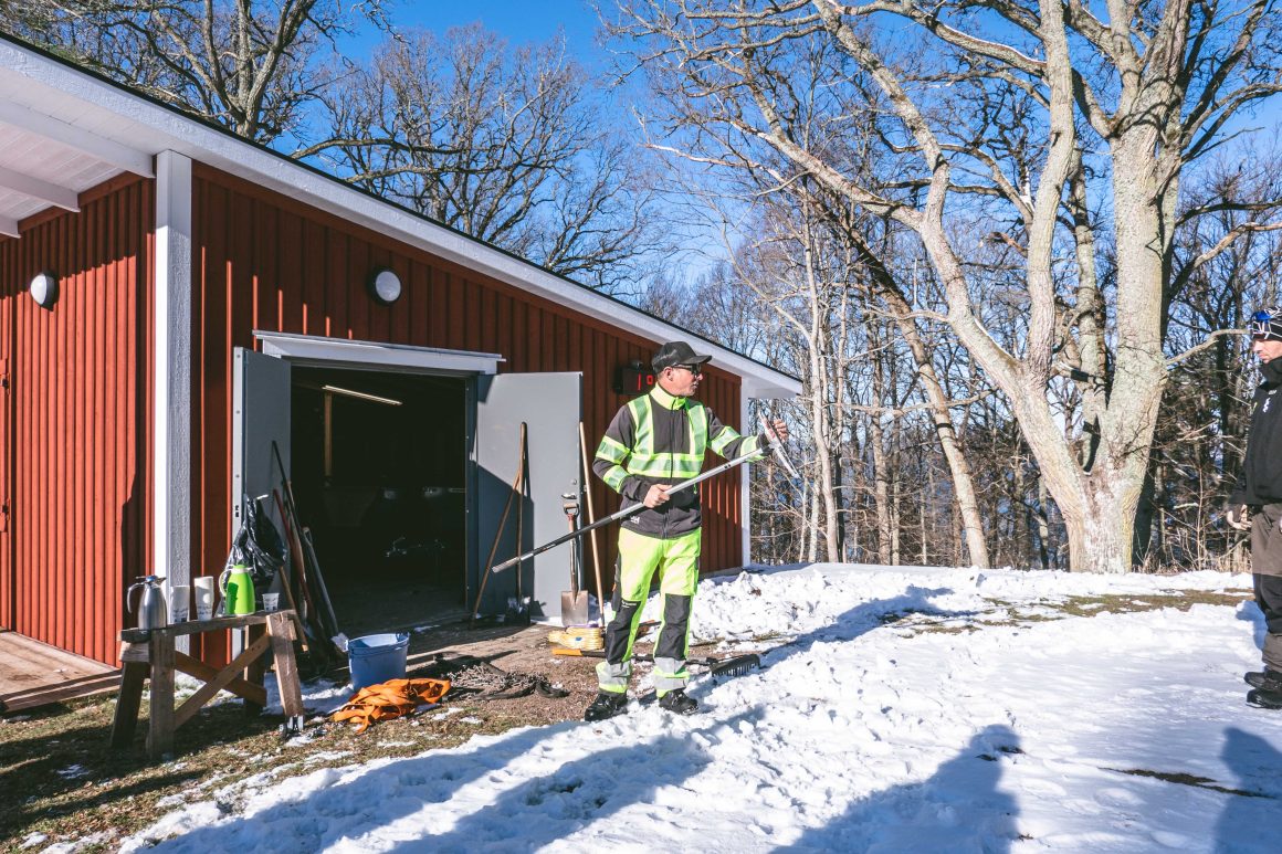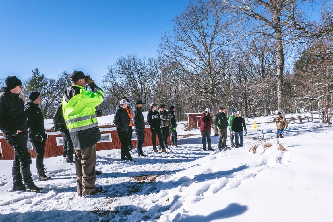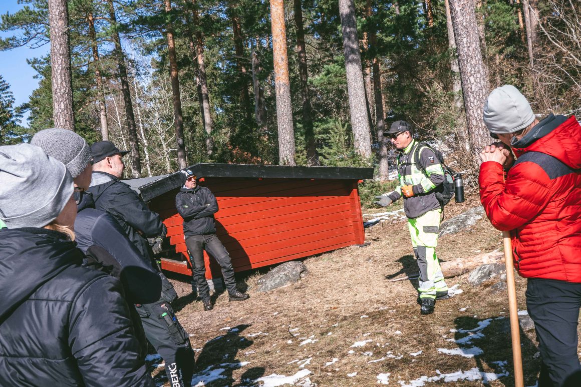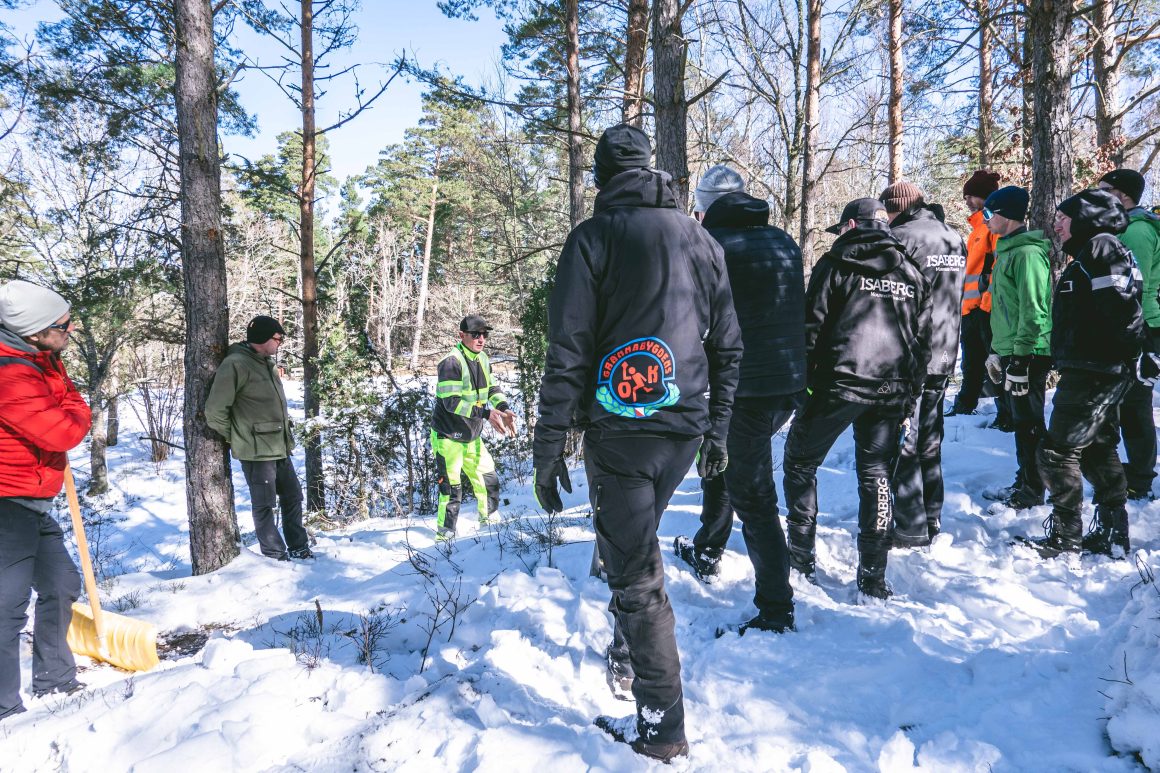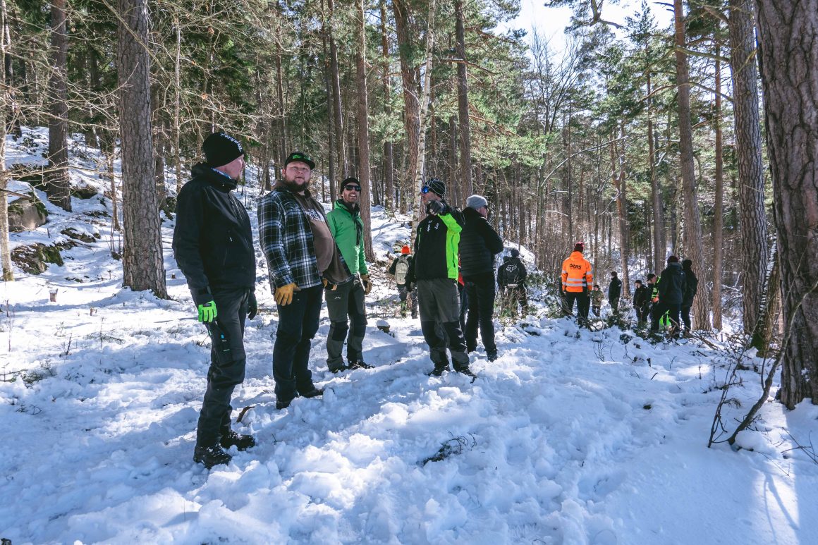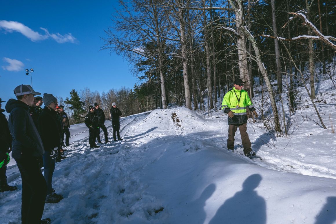 Vi samlades om lördagsmorgonen i GBOK-stugan som ligger nära GBOK MTB Arena på Grännaberget. Marc körde en omgång inomhusteori med introduktion till ledbyggande, termer, djupdykande i teori och ett gäng fina exempel. Sedan blev det utomhusteori – anpassat till den snö som lite oväntat dök upp och täckte stigarna som det var tänkt att vi skulle jobba med.