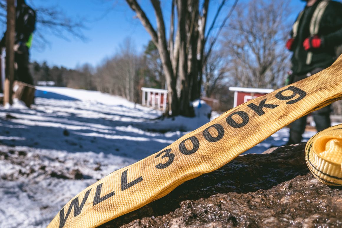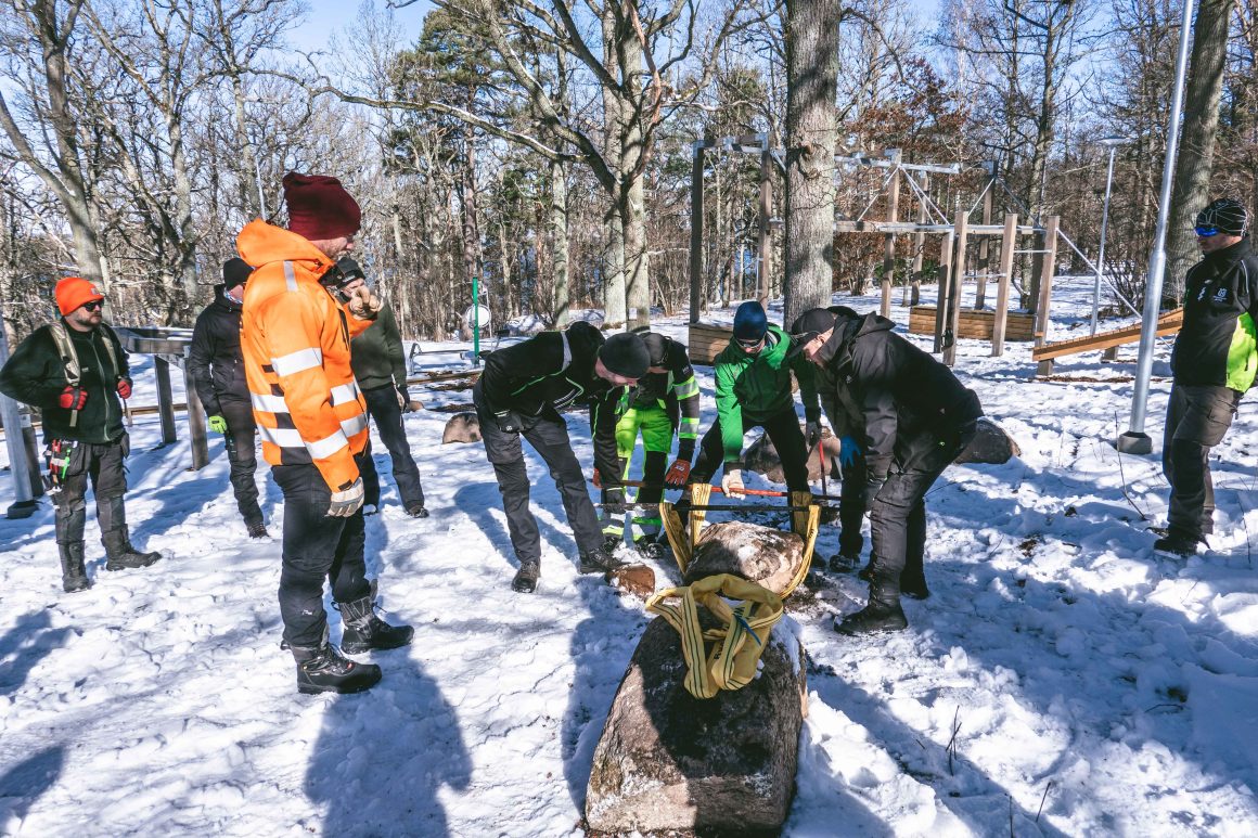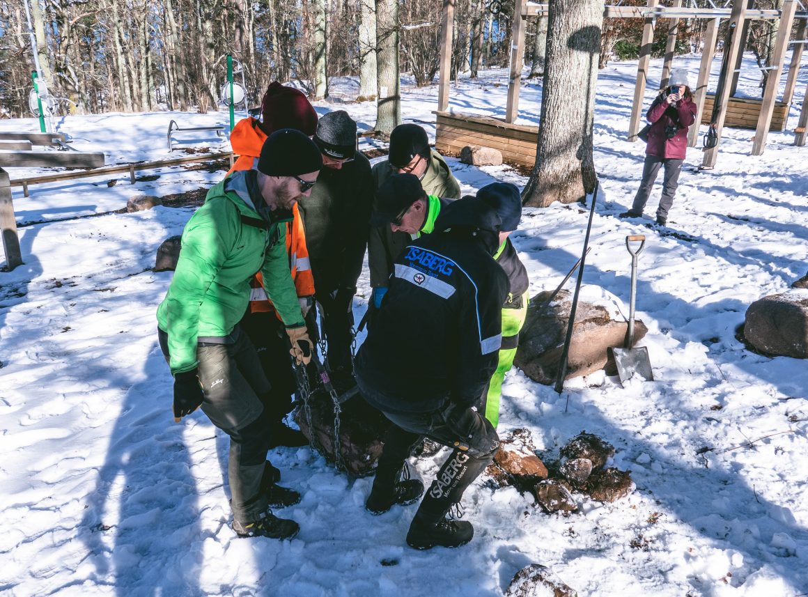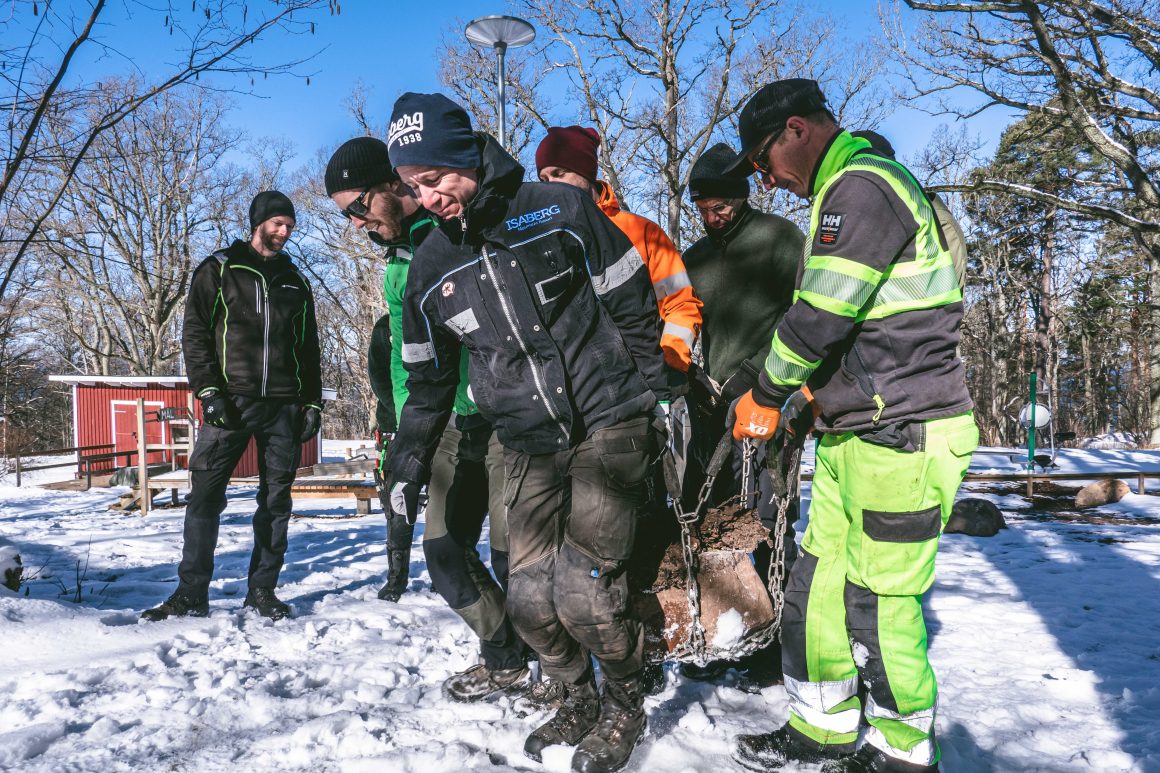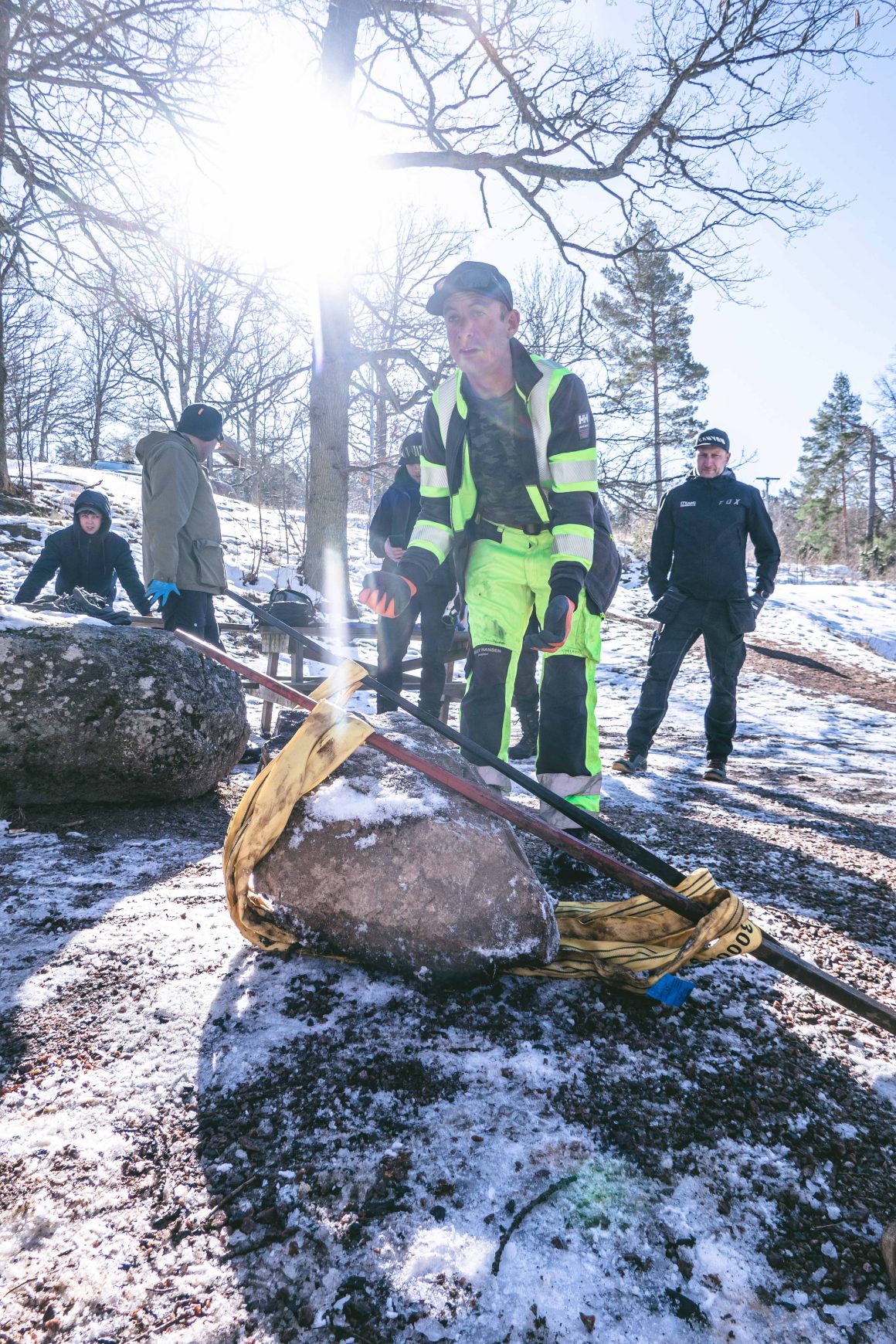 Det finns spindelnät av kedjor man kan transportera stenbumlingar i, det finns smarta tekniker att flytta stenar där man använder spett, rock bars, för att skapa som en räls stenen kan glida på och det går att lyfta med hjälp av straps och spett. Är man flera byggare och har rätt teknik är stenarna plötsligt ganska lätta att hantera. Kul att vi fick prova på olika sätt att flytta runt bumlingar på.