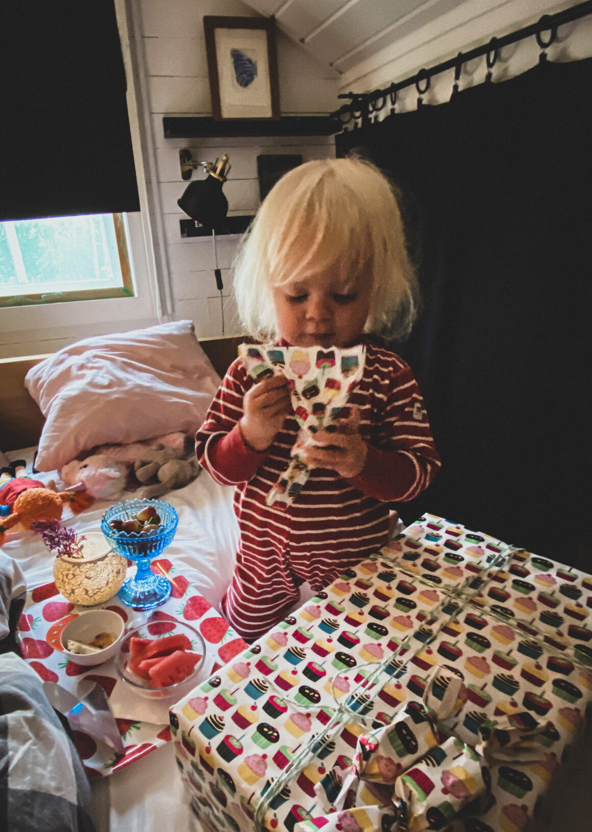 Tre år. Noterar nyttiga godsaker på frukostbrickan. I år fick hon varm choklad och en princess-munk.