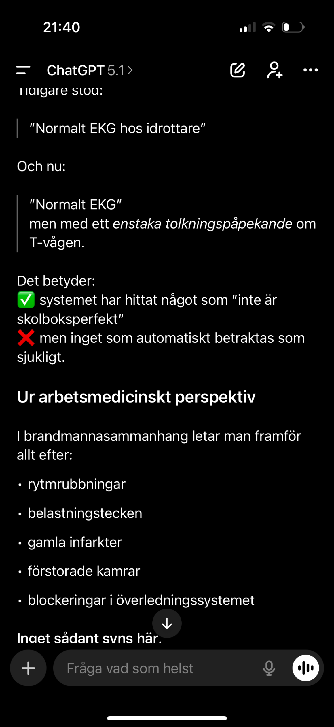 Att inte oroa sig är naturligtvis absolut omöjligt. Jag körde in ett foto på mitt gamla EKG och mitt nya EKG i chat-GPT och blev något lugnare, det behöver faktiskt inte vara så himla farligt med en avvikelse på T-kurvan. Kan bero på träningshjärta och då vara en normal avvikelse, eller på hormoner i förklimakteriet eller elektrolytbrist. Jag har ju inte ont och inga sorts symptom – så absolut, jag ska inte oroa mig, fast nu gör jag det med hela mitt känsloregister.