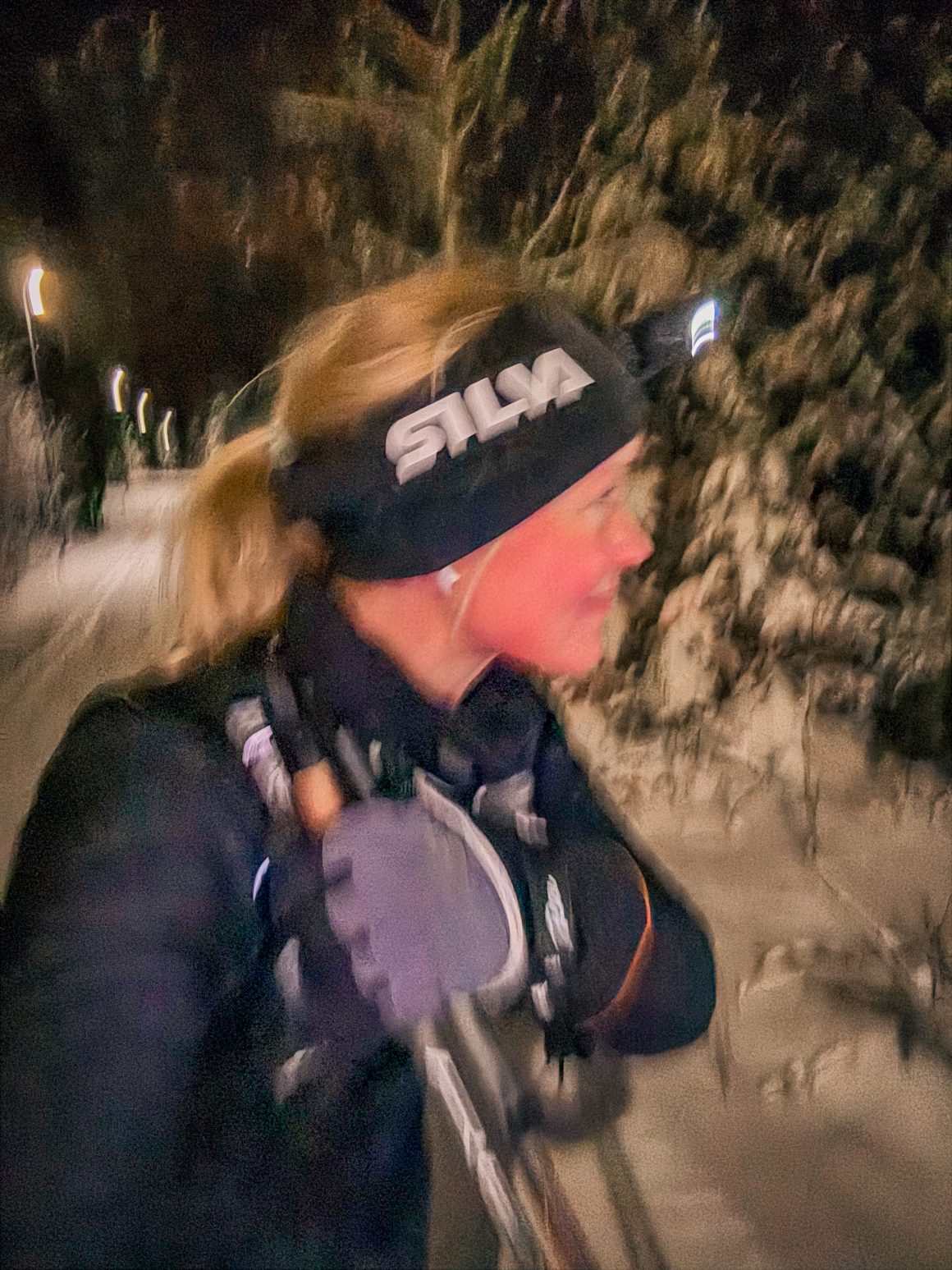 Som ett pärlband av förväntan löper elljusspårets lampsken uppför backen och vidare in i skogen när jag klickar i pjäxorna i skateskidorna. Drar igång klockan. Playar en spellista med Johnossi – det är min to go när jag ska åka skidor.